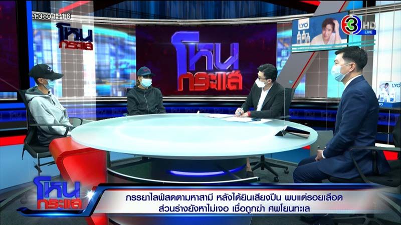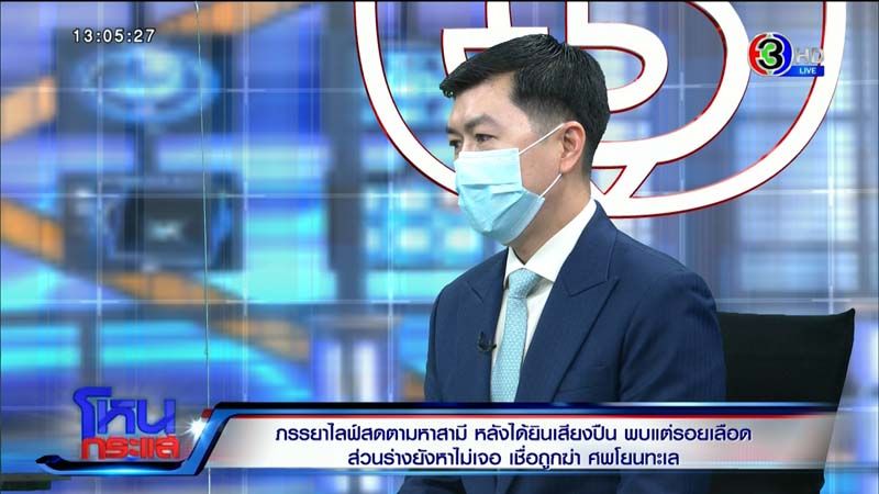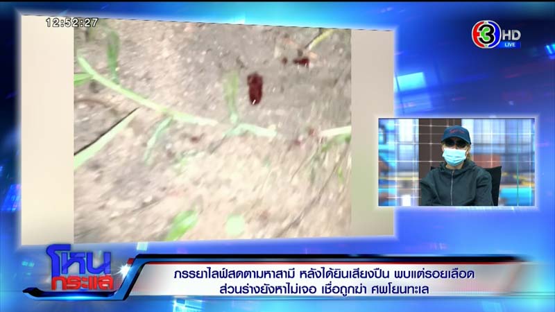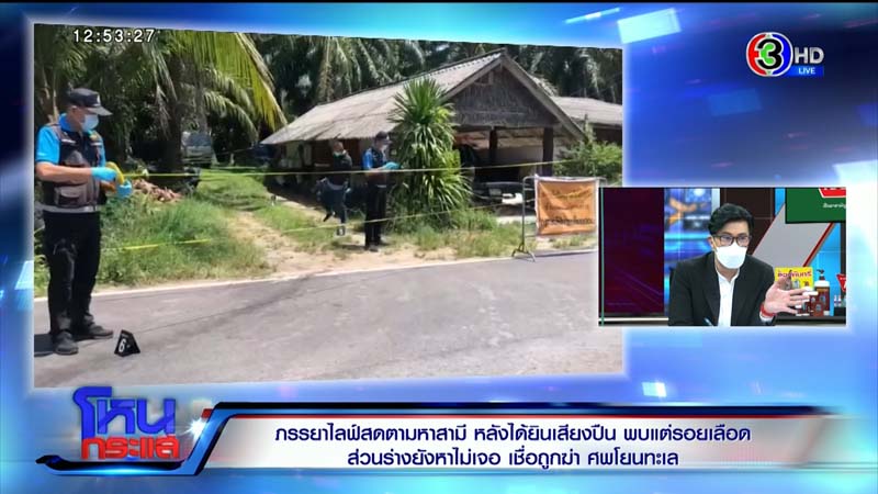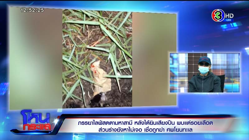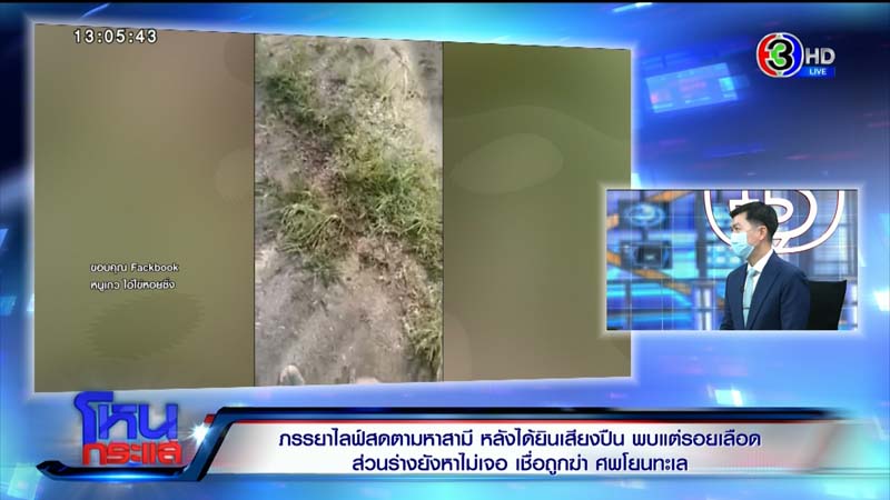 กรณีภรรยาตามหาสามีที่จ.สุราษฎร์ธานี หลังออกไปนั่งดื่ม หลังจากนั้นลูกชายได้ยินเสียงปืนดังขึ้น ภรรยาไลฟ์สดออกไปตามหาสามีแต่ไม่เจอ เจอแต่กองเลือด ณ วันนี้เชื่อว่าสามีถูกอริฆาตกรรมและนำศพไปโยนทิ้งทะเล