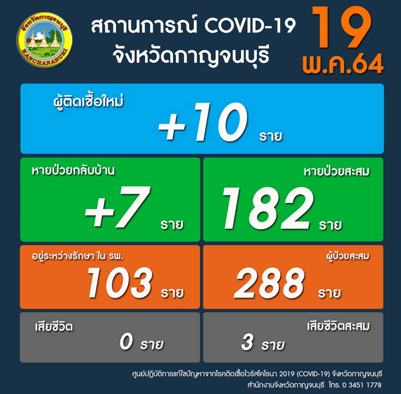 19 พ.ค.64 จากกรณีการแพร่ระบาดของโรคติดเชื้อไวรัสโคโรนา 2019 หรือโควิด-19 ระลอกใหม่ ห้วงเดือน เม.ย.64 ตั้งแต่วันที่ 5 เม.ย.ถึงวันที่ 18 พ.ค.64 ในพื้นที่จังหวัดกาญจนบุรี พบผู้ป่วยสะสม จำนวน 278 ราย รักษาหายสะสม จำนวน 158 ราย รักษาตัวอยู่โรงพยาบาล 116 ราย และเสียชีวิตสะสม จำนวน 3 ราย