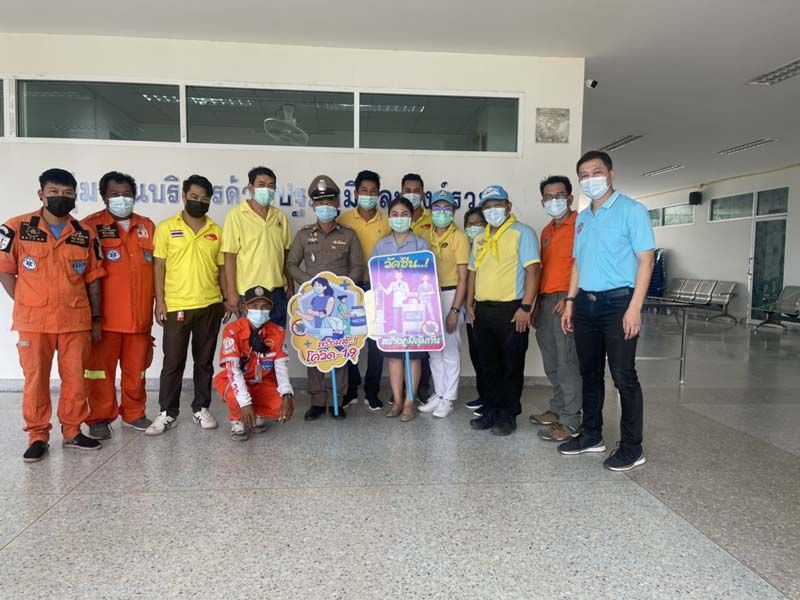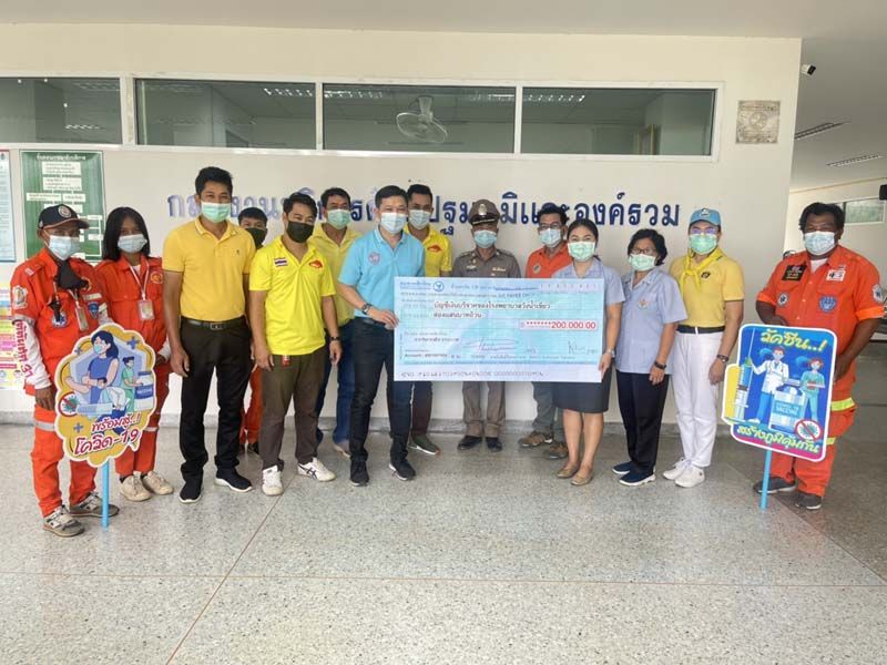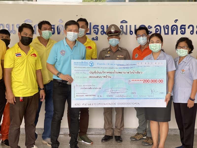 วันเดียวกันที่โรงพยาบาลอำเภอวังน้ำเขียว นายพงษ์เทพ มาลาชาสิงห์ ประธานชมรมส่งเสริมการท่องเที่ยวอำเภอวังน้ำเขียว ร่วมกับ จิตอาสา 904 พร้อมด้วย พ.ต.อ.ธีรพงศ์ ธนโพธิ์ชัย ผกก.สภ.วังน้ำเขียว , สถานีวิจัยสิ่งแวดล้อมสะแกราช , เทศบาลตำบลศาลเจ้าพ่อ , กต.ตร.สภ.วังน้ำเขียว และ เจ้าหน้าที่กู้ภัย ฮุก31 จุดไทยสามัคคีบูรณาการความร่วมมือร่วมด้วยช่วยกันในการร่วมเป็นเกียรติ มอบเงินจำนวน 200,000 บาท โดยการสนับสนุนของคุณพรรณราย พหลโยธิน ผู้บริหาร บริษัท ที.ซี.ฟาร์มา-เคม จำกัด ให้กับ พญ.จิรนิษฐ์ พึ่งสำโรง ผู้อำนวยการโรง พยาบาลวังน้ำเขียว เป็นผู้รับมอบ โดยการประสานงานของจิตอาสา 904 เพื่อซื้อเครื่องมือทางการแพทย์ มาใช้ในงานรักษาผู้ป่วยโควิด19 ผู้ป่วยทั่วๆไป และใช้ในกิจการของโรงพยาบาล