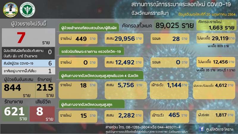 สำหรับสถานการณ์การแพร่ระบาดของไวรัสโควิด-19ในพื้นที่จังหวัดนครราชสีมา ล่าสุดวันนี้พบผู้ติดเชื้อรายใหม่ 7 ราย แยกเป็น พื้นที่อำเภอเมืองนครราชสีมา 4 ราย , อ.ประทาย 1 ราย , อ.ปากช่อง 1 ราย และ อ.พิมาย 1 ราย ส่วนใหญ่ติดเชื้อมาจากการสัมผัสผู้ป่วยรายก่อนหน้า รวมยอดผู้ป่วยระลอกใหม่สะสม 844 ราย โดยอำเภอเมืองนครราชสีมาผู้ป่วยสะสมมากที่สุด 375 ราย ส่วนจำนวนพื้นที่ลดลงเหลือ 30 อำเภอ รักษาหาย 621 ราย ยังรักษาอยู่ 215 ราย ผู้เสียชีวิตสะสม 8 ราย
