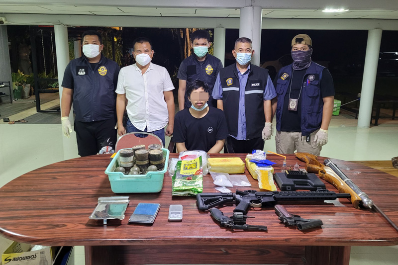 โดยรายแรกจับกุมนายสมชาย หรือต้น นิลสุวรรณ อายุ 26 ปี ขณะอยู่อู่ซ่อมรถจักรยานยนต์ ทีดี มิชนิธ เลขที่ 670/16 ม.5 ต.นาเกลือ อ.บางละมุง จ.ชลบุรี พร้อมกับตรวจค้นภายในตึกแถวเลขที่ 670/5-10 ถ.พัทยานาเกลือ ม.5 ต.นาเกลือ จนพบของกลาง ยาไอซ์น้ำหนักรวม 132.1 กรัม , ยาบ้า 19,800 เม็ด , ลูกระเบิดขว้างแบบเอ็ม67 จำนวน 5 ลูก , อาวุธปืนยาว ขนาด .22 ยี่ห้อทีเอส สีดำ ทะเบียน กท5956182 จำนวน 1 กระบอก , อาวุธปืนพกสั้นแบบลูกโม่ ขนาด .38 ยี่ห้อสมิทแอนด์เวสสัน ไม่มีหมายเลขทะเบียน 1 กระบอก , อาวุธปืนพกสั้น แบบไทยประดิษฐ์ 1 กระบอก , ปืนยาวอัดลม 1 กระบอก , กระสุนปืนขนาดต่างๆ รวม 19 นัด, โทรศัพท์มือถือ 1 เครื่อง และอุปกรณ์การเสพ 1 ชุด โดยกล่าวหาว่า “มียาเสพติดให้โทษ ประเภท 1 (ยาบ้า,ไอซ์) ไว้ในความครอบครองเพื่อจำหน่าย,มีอาวุธปืน วัตถุระเบิด(ที่นายทะเบียนออกใบอนุญาตให้ไม่ได้) และเครื่องกระสุนปืนไว้ในความครอบครองโดยไม่ได้รับอนุญาต และ เสพยาเสพติดให้โทษ ประเภท 1 (เมทแอมเฟตามีน) โดยผิดกฎหมาย” นอกจากนี้ยังยึดทรัพย์สิน ทั้งสังหาฯ และอสังหาริมทรัพย์ ตาม พ.ร.บ.มาตรการในการปราบปรามผู้กระทำความผิดเกี่ยวกับยาเสพติด พ.ศ.2534 รวมมูลค่ากว่า 3,115,000 บาท