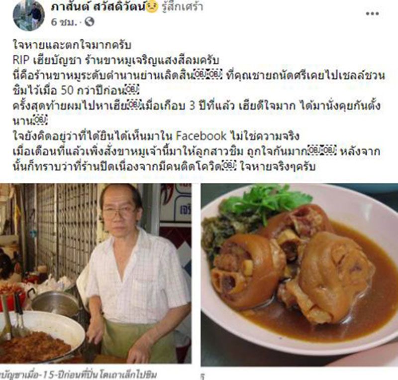 ขณะที่ กลุ่มเฟซบุ๊ก @ตามหาของอร่อยริมทาง ยันขึ้นเหลา กับ ลุงอ้วน กินกะเที่ยว ได้มีการแจ้งข่าวระบุ "ขอแสดงความเสียใจด้วยครับ เจ้าของร้านขาหมูในตำนาน ที่ต้องจากไปจากเหตุโควิด" ซึ่งมีเหล่าลูกค้าร้านขาหมูเจริญแสงสีลม เข้ามาแสดงความเสียใจกันเป็นจำนวนมาก
