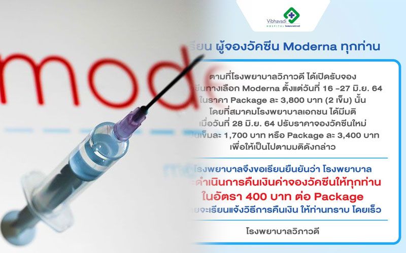 ล่าสุด โรงพยาบาลวิภาวดีออกประกาศแจ้งประชาชนผู้จองวัคซีน “โมเดอร์นา” ว่า ตามที่ รพ.วิภาวดี ได้เปิดรับจองวัคซีนทางเลือก “โมเดอร์นา” ตั้งแต่วันที่ 16-27 มิถุนายน 2564 ในราคาแพคเกจละ 3,800 บาท (2 เข็ม) นั้น โดยที่สมาคมโรงพยาบาลเอกชนมีมติใหม่เป็นเข็มละ 1,700 บาท หรือแพคเกจละ 3,400 บาท