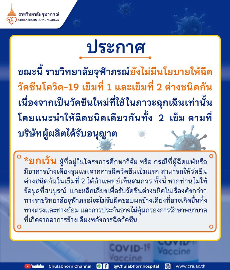 ยกเว้น กรณีผู้อยู่ในโครงการศึกษาวิจัย หรือ กรณีผู้ฉีดแพ้หรือมีอาการข้างเคียงรุนแรงจากการฉีดวัคซีนเข็มแรก สามารถให้วัคซีนต่างชนิดในเข็มที่ 2 ได้ หากแพทย์เห็นสมควร ทั้งนี้ หากท่านไม่ให้ข้อมูลที่สมบูรณ์หรือหลีกเลี่ยงการให้ข้อมูลเพื่อรับวัคซีนต่างชนิดดังกล่าว ทางราชวิทยาลัยจะไม่รับผิดชอบผลข้างเคียงที่อาจเกิดขึ้นทั้งทางตรงและทางอ้อม และการประกันภัยอาจไม่คุ้มครองการรักษาพยาบาลที่อาจเกิดจากผลข้างเคียงหลังการฉีดวัคซีน