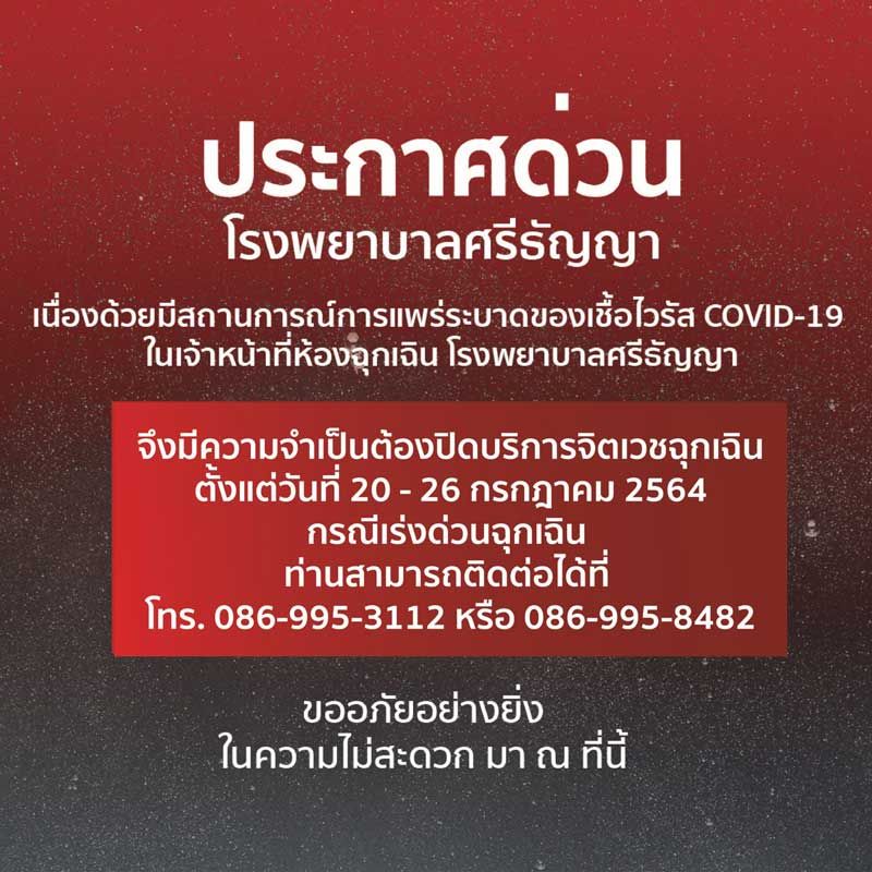 เนื่องด้วยมีสถานการณ์การแพร่ระบาดของเชื้อโควิด-19 ในบุคลากรห้องฉุกเฉิน โรงพยาบาลศรีธัญญา ทางโรงพยาบาลศรีธัญญาจึงมีความจำเป็นต้องปิดบริการในส่วน “ห้องจิตเวชฉุกเฉิน” ตั้งแต่วันที่ 20 - 26 กรกฎาคม 2564 กรณีเร่งด่วนฉุกเฉิน ท่านสามารถติดต่อได้ที่โทร 086-995-3112 หรือ 086-995-8482 ทางโรงพยาบาลศรีธัญญาและกรมสุขภาพจิต ขออภัยพี่น้องประชาชนอย่างยิ่งในความไม่สะดวก มา ณ ที่นี้