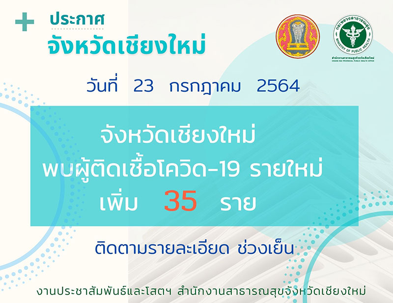 เมื่อวันที่ 23 กรกฎาคม 2564 ที่ศูนย์บัญชาการสถานการณ์การระบาดโรค Covid-19 จังหวัดเชียงใหม่ ดร.ทรงยศ คำชัย หัวหน้ากลุ่มงานควบคุมโรคติดต่อ สำนักงานสาธารณสุขจังหวัดเชียงใหม่ แถลงสถานการณ์การระบาดโรค Covid-19 จังหวัดเชียงใหม่ประจำวัน ว่า เมื่อวานนี้ (22 ก.ค.64) ได้มีการตรวจคัดกรองหาเชื้อโควิด-19 ในกลุ่มผู้สัมผัสหรือผู้เสี่ยงสูง จำนวน 3,000 ราย พบผู้มีผลบวก 33 ราย คิดเป็นร้อยละ 1.10 โดยปัจจัยเสี่ยงการติดเชื้อในชุมชนพบว่าลดลง แสดงให้เห็นว่าการควบคุมคลัสเตอร์ประสบผลสำเร็จ เพราะสามารถคัดกรองได้โดยเร็วและครอบคลุม ขณะที่ปัจจัยเสี่ยงจากการนำเชื้อเข้ามาจากต่างพื้นที่ยังคงสูง