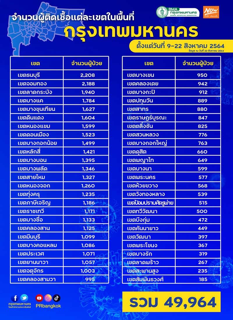 22 สิงหาคม 2564 เพจ “กรุงเทพมหานคร โดยสำนักงานประชาสัมพันธ์” สรุปจำนวนผู้ติดเชื้อแต่ละเขตใน กทม. ตั้งแต่วันที่ 9-22 สิงหาคม 2564 รวม 50 เขต มีผู้ติดเชื้อ 49,964 ราย (ข้อมูล ณ วันที่ 22 สิงหาคม 2564) โดยพบว่ามี 24 เขตที่ตัวเลขผู้ติดเชื้ออยู่ในหลักพัน และในบรรดา 50 เขต พบว่า เขตสัมพันธวงศ์ มีผู้ติดเชื้อน้อยที่สุด คือ 185 ราย