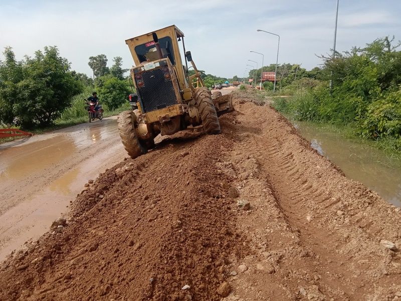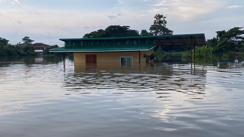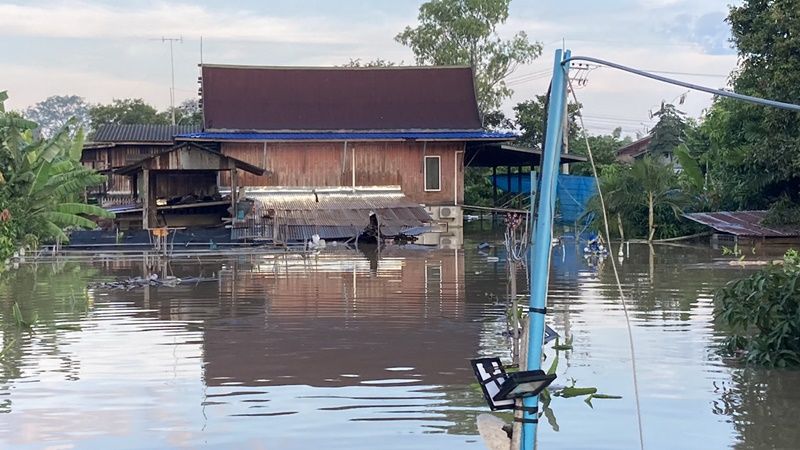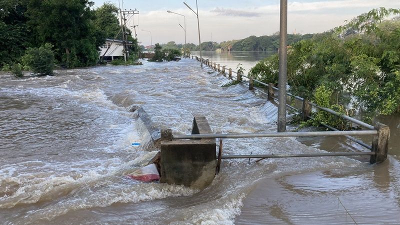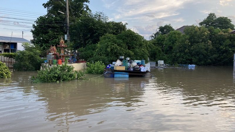จระเข้ร้องยังคงอ่วม! น้ำเจ้าพระยาไหลทะลักเข้าท่วมบ้านเรือนประชาชนสูงขึ้นต่อเนื่อง เจ้าหน้าที่เร่งนำดินลูกรังมาเสริมแนวถนนทางหลวงชนบทกั้นน้ำไม่ไห้ขยายวงกว้าง