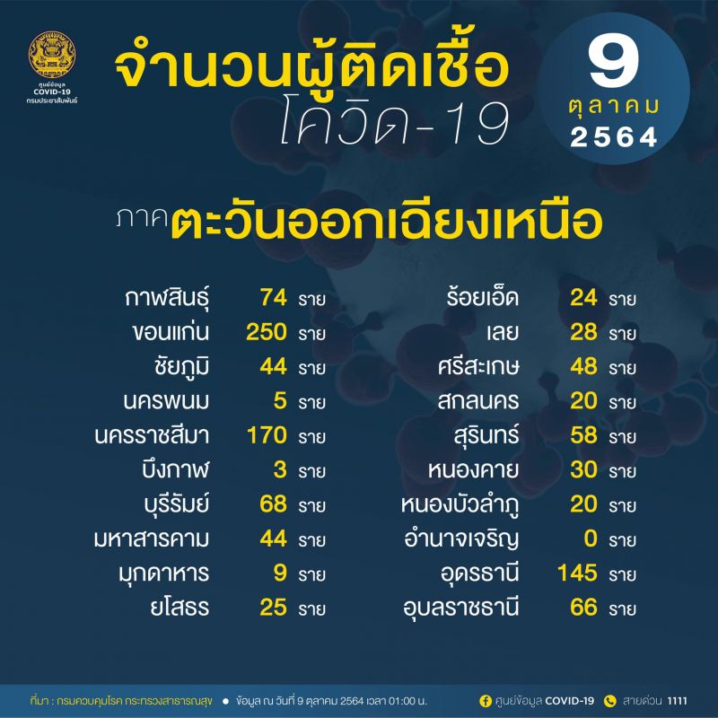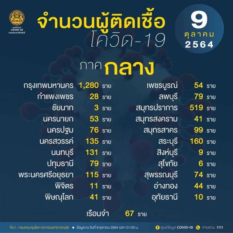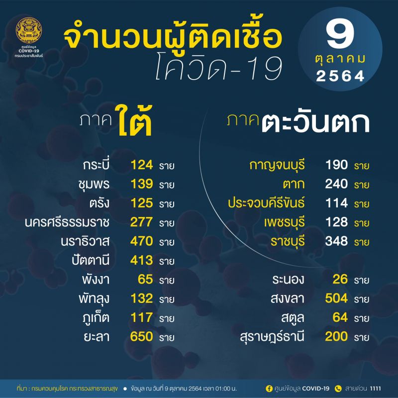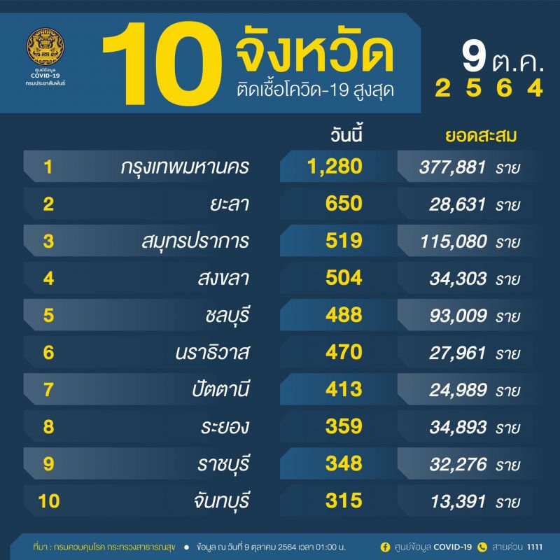 9 ตุลาคม 2564 ศูนย์ข้อมูล COVID-19 รายงานสถานการณ์ 10 อันดับจังหวัดที่มีจำนวนผู้ติดเชื้อโควิดในประเทศรายใหม่สูงสุด โดยมีรายละเอียดดังนี้...