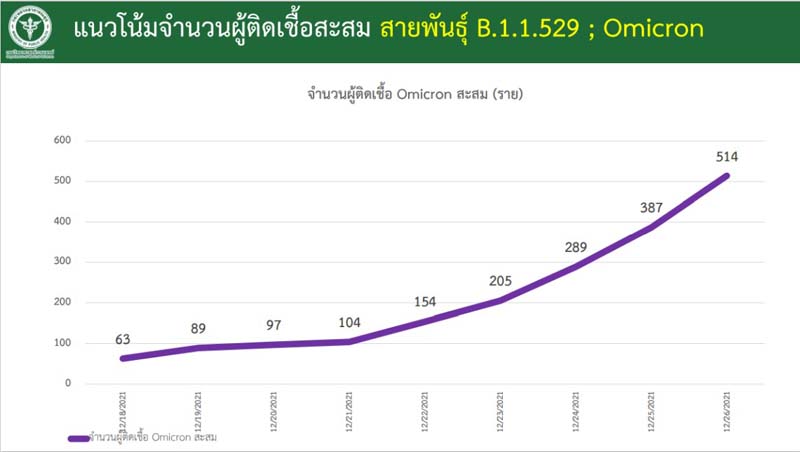 ปลัดสธ. กล่าวอีกว่า สำหรับประเทศไทย ตั้งแต่วันที่ 18 ธ.ค.เป็นต้นมา สามารถคัดกรองผู้เข้าประเทศ โดยคิดเป็นโอมิครอนสะสม 514 ราย ส่วนใหญ่อยู่ในการควบคุม มีบางส่วนที่เล็ดลอดและไปเยี่ยมญาติ อาจทำให้เกิดการแพร่เชื้อก่อนหน้านี้ แต่ต้นเชื้อมีประมาณ 500 กว่าราย ส่วนอาการของผู้ป่วยประมาณ 90% เป็นอาการน้อยหรือไม่มีอาการ อาการเล็กน้อยอยู่ประมาณ 10 กว่า% และอาการมาก 3-4% ทั้งนี้ที่ประเทศอังกฤษมีการศึกษาและรายงานว่า โอไมครอนเมื่อเทียบกับเดลตา จะน้อยกว่าประมาณครึ่งหนึ่งที่จะต้องไปอยู่ รพ. เมื่อติดเชื้อแล้ว ขณะที่แอฟริกาใต้ก็เช่นเดียวกัน และมักพบว่าเชื้อไม่ได้ลงปอด แต่จะอยู่ที่แถวๆ คอ และหลอดลม