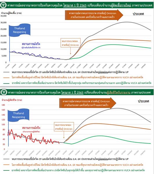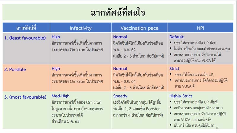 อย่างไรก็ตาม จากการระบาดของโอมิครอน ทางกระทรวงสาธารณสุขจึงได้มอบให้ทางกรมควบคุมโรคจัดทำฉากทัศน์ขึ้นมา พบว่า โอมิครอนระบาดเร็วกว่า ง่ายกว่า แต่ความรุนแรงน้อยกว่าเดลตา ซึ่งหลายประเทศ อย่างสิงคโปร์ก็ออกมาว่าโอมิครอนไม่ได้รุนแรงมาก แต่เราต้องพยายามป้องกันการติดเชื้อให้มาก ไม่ให้มีการแพร่ระบาดรวดเร็วเกินไปนัก เพราะหากแพร่ระบาดและมีคนป่วยมากๆ จะกระทบต่อระบบการดูแลของสาธารณสุข หากเราสามารถพยากรณ์ว่า ความสามารถของโอมิครอนหากมากขึ้น แต่ขณะเดียวกันมีการฉีดวัคซีนพื้นฐานได้จะเป็นอย่างไร โดยฉากทัศน์มี 3 แบบ คือ