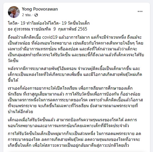 9 กุมภาพันธ์ 2565 ศ.นพ.ยง ภู่วรวรรณ ราชบัณฑิต และหัวหน้าศูนย์เชี่ยวชาญเฉพาะด้านไวรัสวิทยา คลินิกภาควิชากุมารเวชศาสตร์ คณะแพทยศาสตร์ จุฬาลงกรณ์มหาวิทยาลัย โพสต์ข้อความผ่านเฟซบุ๊ก Yong Poovorawan หัวข้อ “โควิด- 19 ทำไมต้องให้โควิด- 19 วัคซีนในเด็ก” มีเนื้อหาดังนี้...