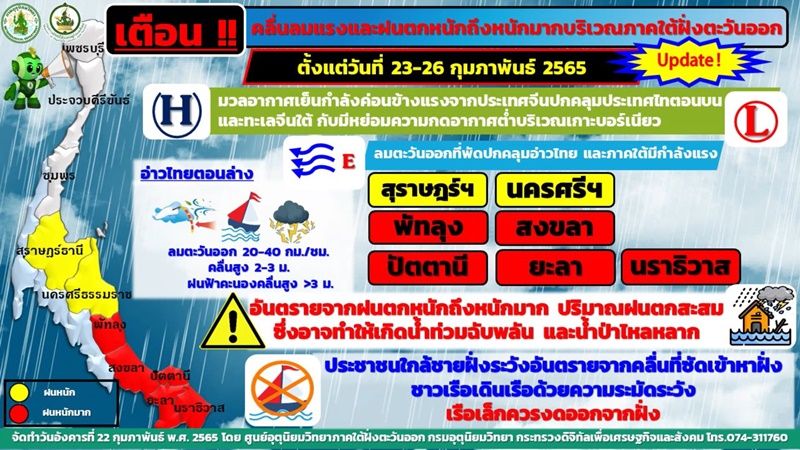ศูนย์อุตุนิยมวิทยาภาคใต้ฝั่งตะวันออก ออกประกาศเตือน ฉบับที่ 2 (2/2565) เรื่อง "คลื่นลมแรงและฝนตกหนักบริเวณภาคใต้ฝั่งตะวันออก (มีผลกระทบตั้งแต่วันที่ 23-26 กุมภาพันธ์ 2565)" โดยบริเวณความกดอากาศสูง หรือมวลอากาศเย็นกำลังค่อนข้างแรงจากประเทศจีนปกคลุมประเทศไทยตอนบน และทะเลจีนใต้ ส่งผลให้ลมตะวันออกที่พัดปกคลุมอ่าวไทยและภาคใต้มีกำลังแรง ทำให้ภาคใต้ฝั่งตะวันออกในช่วงวันที่ 23-26 ก.พ.65 มีฝนหนักหลายพื้นที่บริเวณจังหวัดสุราษฎร์ธานี นครศรีธรรมราช พัทลุง สงขลา ปัตตานี ยะลา และนราธิวาส ขอให้ประชาชนในพื้นที่เสี่ยงภัยบริเวณจังหวัดดังกล่าวระมัดระวังอันตรายจากฝนตกหนัก ปริมาณฝนตกสะสม ซึ่งอาจทำให้เกิดน้ำท่วมฉับพลัน และน้ำป่าไหลหลาก