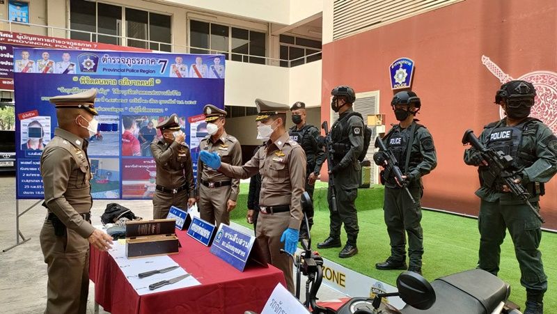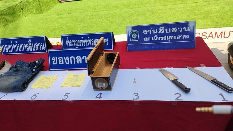 วันที่ 28 ก.พ.65 พล.ต.ท.ธนายุตม์ วุฒิจรัสธำรงค์ ผบช.ภ.7 พล.ต.ต.อภิชาติ วรรณภักดิ์ ผบก.ภ.จว.สมุทรสาคร พร้อม พ.ต.อ.ธนากร วงศ์สิริลักษณ์ ผกก.สภ.เมืองสมุทรสาคร ร่วมกันแถลงข่าวการจับกุมนายอนุชา (ขอสงวนนามสกุล) อายุ 25 ปี อยู่หมู่ที่ 13 อำเภอมวกเหล็ก จังหวัดสระบุรี พร้อมของกลางมีดปอกผลไม้ยาวประมาณ 25 เซนติเมตรจำนวน 2 เล่ม รถจักรยานยนต์ 1 คัน