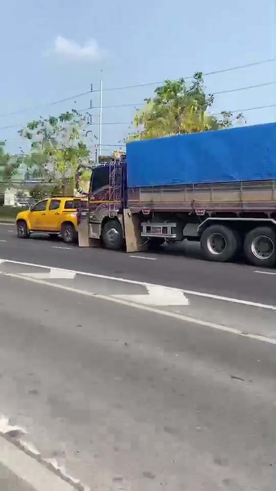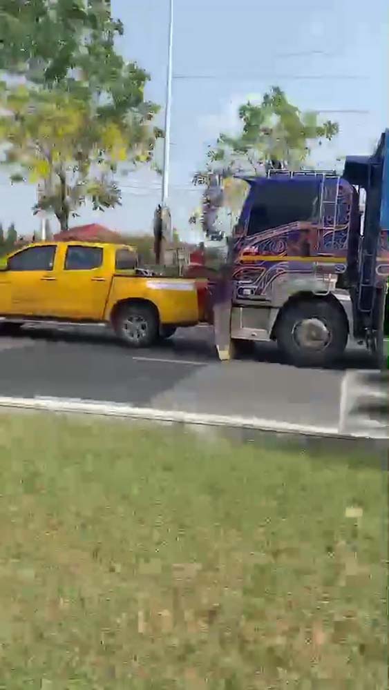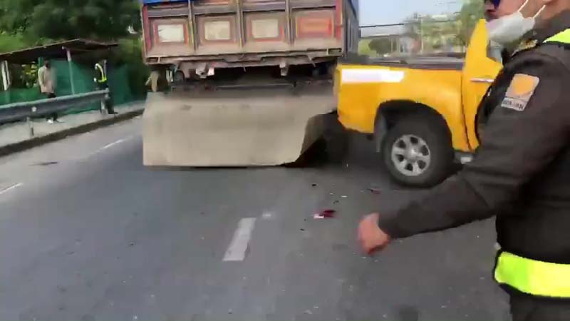17 มี.ค.65 ผู้สื่อข่าวรายงานว่า จากเหตุการณ์เมื่อวันที่ 16 มี.ค.ที่ผ่านมา ขณะเจ้าหน้าที่แขวงทางหลวง ตั้งจุดตรวจรถบรรทุกที่มีน้ำหนักเกินบริเวณถนนนครอินทร์ ตรงข้ามตลาดพระราม 5 อ.บางกรวย จ.นนทบุรี พบเห็นรถบรรทุกพ่วง 22 ล้อติดฟิล์มดำ ขับมาด้วยความเร็วจึงได้เรียกให้จอดเพื่อขอตรวจดูเอกสารน้ำหนักสิ่งของที่บรรทุกมา เมื่อรถคันดังกล่าวชะลอตัวและหยุดรถ เจ้าหน้าที่พยายามเรียกให้เปิดกระจกและเปิดประตูรถเพื่อขอดูเอกสาร ปรากฎว่าคนขับรถไม่ยอมเปิดประตู เจ้าหน้าที่เห็นท่าไม่ดีจึงได้นำรถกระบะขึ้นมาประกบด้านข้างและด้านหน้าเพื่อไม่ให้รถบรรทุกพ่วงคันดังกล่าวหลบหนีได้ แต่คนขับรถได้หักเลี้ยวหัวรถเพื่อหลบหนีทำให้รถบรรทุกพ่วงไปเบียด และชนกับรถกระบะของเจ้าหน้าที่พังเสียหาย ก่อนที่จะเร่งเครื่องหลบหนีต่อไปบนถนนนครอินทร์ขาออก จากนั้นเจ้าหน้าที่ได้นำรถกระบะอีก 1 คันขับตามไปและแซงขึ้นไปอยู่ที่หน้ารถบรรทุกพ่วง เพื่อให้หยุดรถแต่คนขับรถบรรทุกไม่ยอมจอด ทางเจ้าหน้าที่เห็นว่าไม่ปลอดภัยจึงได้ยกเลิกการติดตาม และให้เจ้าหน้าที่กรมทางหลวงเข้าแจ้งความที่ สภ.บางกรวย