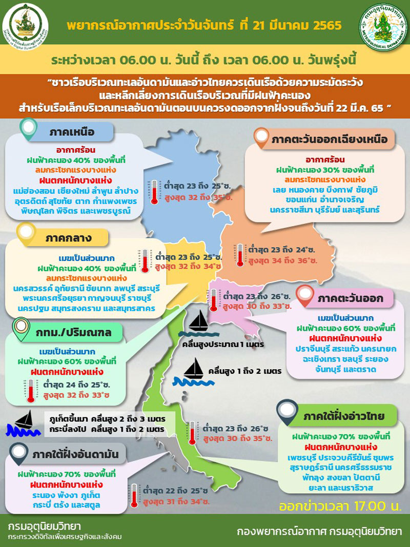 เมื่อเวลา 05.00 น.วันที่ 21 มีนาคม 2565 กรมอุตุนิยมวิทยา รายงานลักษณะอากาศทั่วไป พยากรณ์อากาศ 24 ชั่วโมงข้างหน้า บริเวณภาคเหนือ ภาคกลาง และภาคตะวันออกมีฝนเพิ่มขึ้น กับมีฝนตกหนักบางแห่ง และมีลมกระโชกแรง ขอให้ประชาชนบริเวณประเทศไทยตอนบนระวังอันตรายจากฝนฟ้าคะนองและลมกระโชกแรงที่เกิดขึ้นในระยะนี้ไว้ด้วย