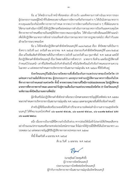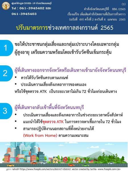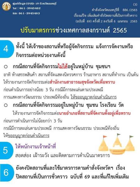 6 เมษายน 2565 นายสุจินต์ ไชยชุมศักดิ์ ผู้ว่าราชการจังหวัดนนทบุรี ประธานกรรมการโรคติดต่อจังหวัดนนทบุรี ผู้กำกับการบริหารราชการในสถานการณ์ฉุกเฉินจังหวัดนนทบุรีจังหวัดนนทบุรี มีคำสั่งจังหวัดที่ 886/2565 เรื่องแก้ไขเพิ่มเติมคำสั่งปิดสถานที่เป็นการชั่วคราวฉบับที่ 69 ครั้งที่ 2 ปรับมาตรการควบคุมแบบบูรณาการเป็นกรณีเฉพาะรองรับช่วงเทศกาลสงกรานต์ พ.ศ. 2565 โดยเน้น 3 ส่วนหลัก คือ