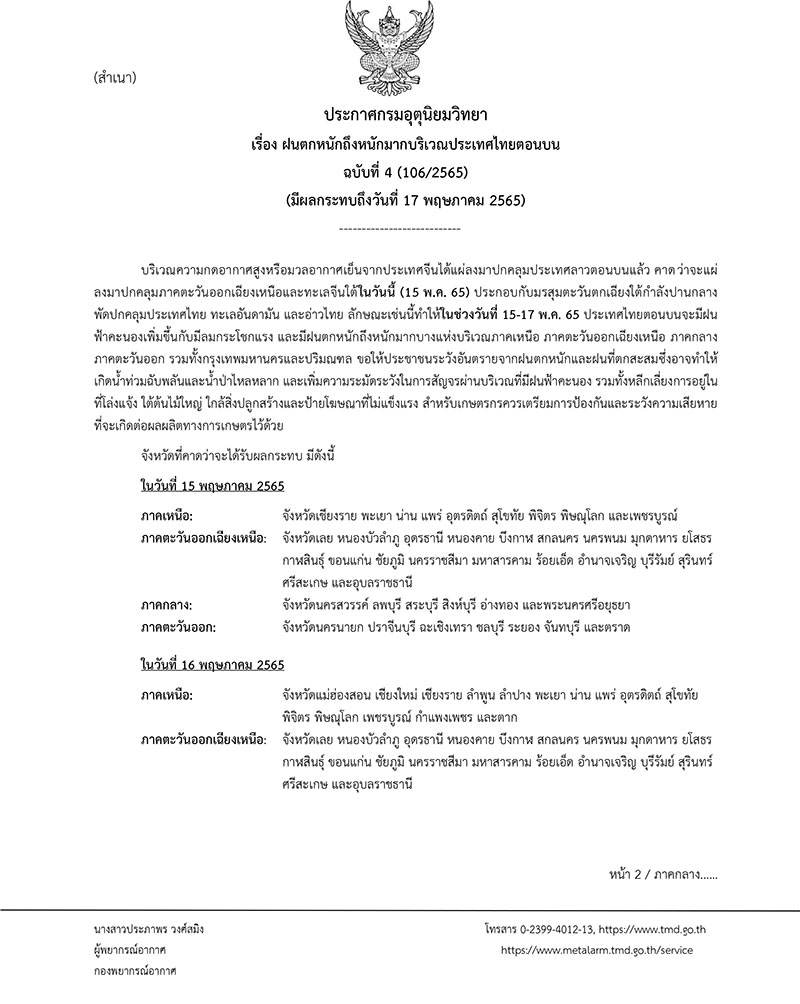 กรมอุตุนิยมวิทยา ประกาศ "ฝนตกหนักถึงหนักมากบริเวณประเทศไทยตอนบน" (มีผลกระทบถึงวันที่ 17 พฤษภาคม 2565) ฉบับที่ 4 ลงวันที่ 15 พฤษภาคม 2565 ระบุว่า บริเวณความกดอากาศสูงหรือมวลอากาศเย็นจากประเทศจีนได้แผ่ลงมาปกคลุมประเทศลาวตอนบนแล้ว คาดว่าจะแผ่ ลงมาปกคลุมภาคตะวันออกเฉียงเหนือและทะเลจีนใต้ในวันนี้ (15 พ.ค.65) ประกอบกับมรสุมตะวันตกเฉียงใต้กำลังปานกลางพัดปกคลุมประเทศไทย ทะเลอันดามัน และอ่าวไทย ลักษณะเช่นนี้ทำให้ในช่วงวันที่ 15-17 พ.ค.65 ประเทศไทยตอนบนจะมีฝนฟ้าคะนองเพิ่มขึ้นกับมีลมกระโชกแรง และมีฝนตกหนักถึงหนักมากบางแห่งบริเวณภาคเหนือ ภาคตะวันออกเฉียงเหนือ ภาคกลาง ภาคตะวันออก รวมทั้งกรุงเทพมหานครและปริมณฑล ขอให้ประชาชนระวังอันตรายจากฝนตกหนักและฝนที่ตกสะสมซึ่งอาจทำให้เกิดน้ำท่วมฉับพลันและน้ำป่าไหลหลาก และเพิ่มความระมัดระวังในการสัญจรผ่านบริเวณที่มีฝนฟ้าคะนอง รวมทั้งหลีกเลี่ยงการอยู่ในที่โล่งแจ้ง ใต้ต้นไม้ใหญ่ ใกล้สิ่งปลูกสร้างและป้ายโฆษณาที่ไม่แข็งแรง สำหรับเกษตรกรควรเตรียมการป้องกันและระวังความเสียหายที่จะเกิดต่อผลผลิตทางการเกษตรไว้ด้วย