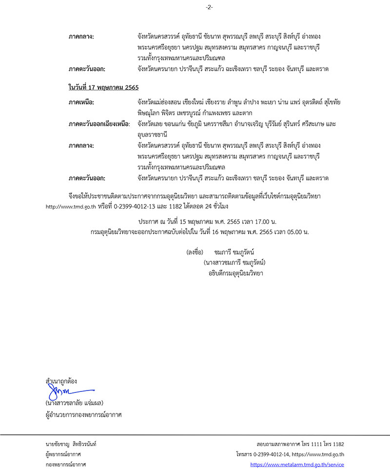 จึงขอให้ประชาชนติดตามประกาศจากกรมอุตุนิยมวิทยา และสามารถติดตามข้อมูลที่เว็บไซต์กรมอุตุนิยมวิทยา http://www.tmd.go.th หรือที่ 0-2399-4012-13 และ 1182 ได้ตลอด 24 ชั่วโมง