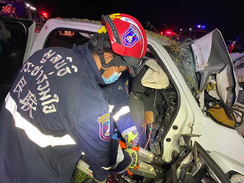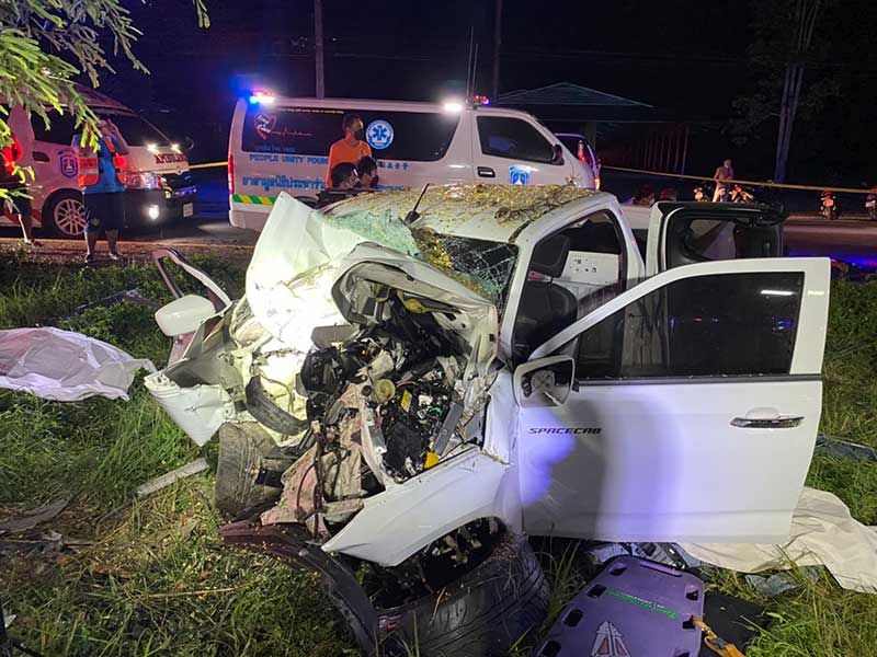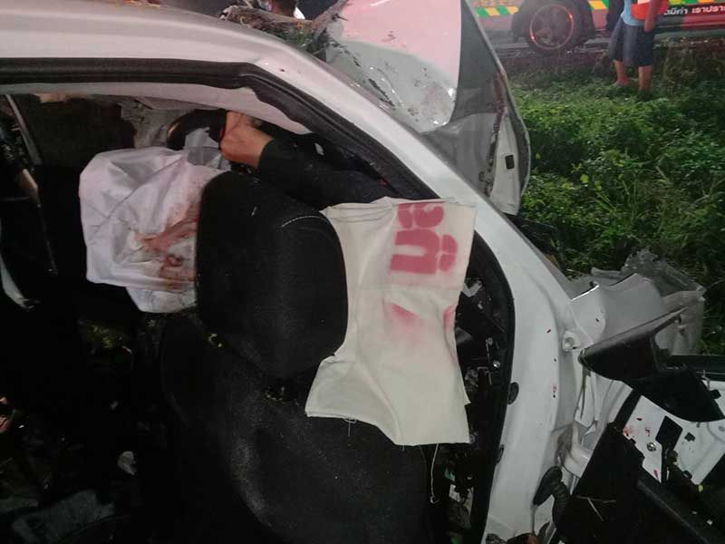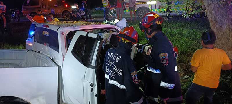 เมื่อถึงที่เกิดเหตุพบซากรถกระบะ ยี่ห้ออีซูซุ ดีแม๊ก ตอนครึ่ง สีขาว ทะเบียน ผต - 975 นครศรีธรรมราช สภาพชนอัดก๊อปปี้ต้นมะขามขนาดใหญ่ บริเวณร่องกลางถนน จนด้านหน้ารถยุบพังยับเยิน ส่วนในห้องโดยสารรถพบร่างผู้เสียชีวิต 5 ศพ เป็นชาย 2 ศพ หญิง 3 ศพ และมีคนเจ็บสาหัสอีก 1 ราย เป็นชาย เจ้าหน้าที่จึงรีบส่งโรงพยาบาลท่าศาลา นอกจากนี้ที่เกิดเหตุเจ้าหน้าที่ยังพบร่องรอยร่องกลางถนนรถเสียหลักตกลงร่องกลางถนนเป็นทางยาวกว่า 100 เมตร ก่อนจะพุ่งชนอัดก๊อปปี้ต้นมะขามร่องกลางถนน