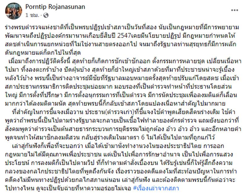 วันที่ 10 มิถุนายน 2565 แพทย์หญิง คุณหญิง พรทิพย์ โรจนสุนันท์ ผู้อำนวยการสถาบันนิติวิทยาศาสตร์ สมาชิกวุฒิสภา (ส.ว.)โพสต์ข้อความในเฟซบุ๊กถึงกรณีที่ประชุมรัฐสภาพิจารณา ร่างพ.ร.บ.ตำรวจแห่งชาติ ว่า
