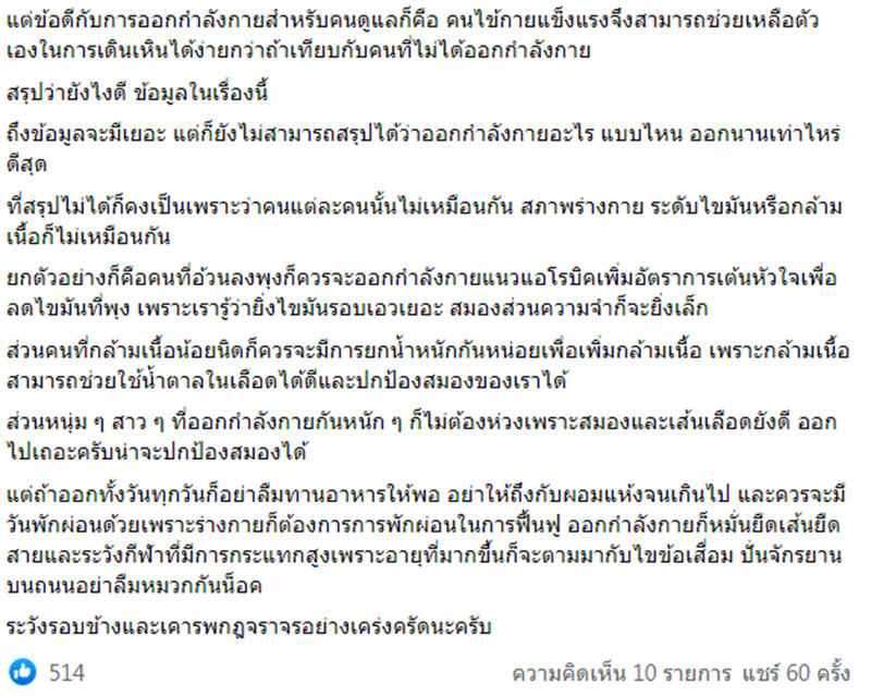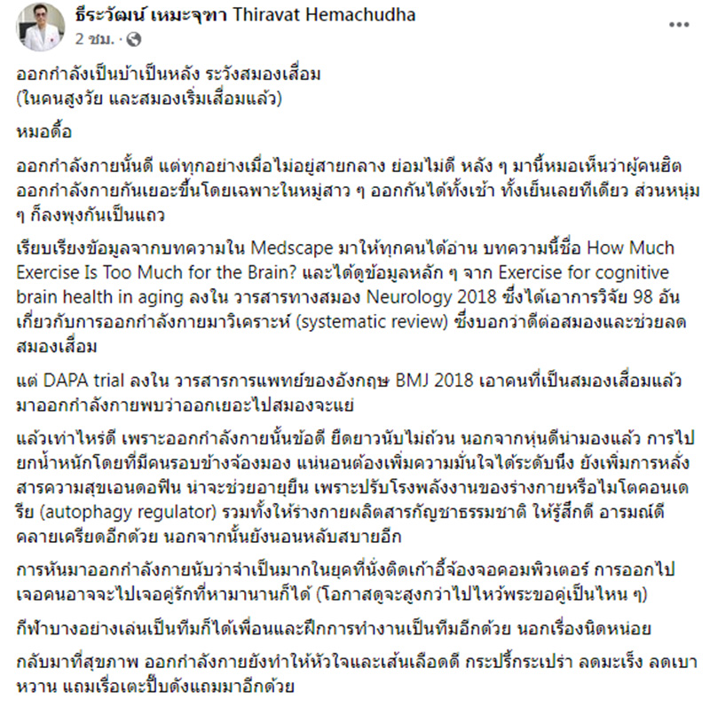 วันที่ 10 มิถุนายน 2565 ศ.นพ.ธีระวัฒน์ เหมะจุฑา หัวหน้าศูนย์วิทยาศาสตร์สุขภาพโรคอุบัติใหม่ คณะแพทยศาสตร์ โรงพยาบาลจุฬาลงกรณ์ โพสต์ผ่านเฟซบุ๊กระบุว่า ออกกำลังเป็นบ้าเป็นหลัง ระวังสมองเสื่อม(ในคนสูงวัย และสมองเริ่มเสื่อมแล้ว) หมอดื้อ