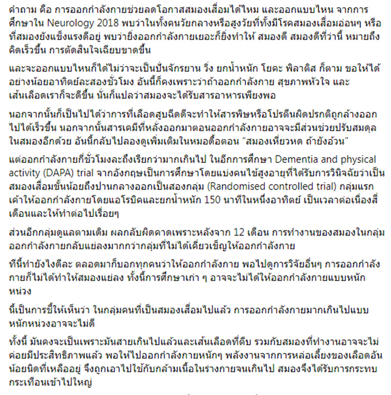 คำถาม คือ การออกกำลังกายช่วยลดโอกาสสมองเสื่อมได้ไหม และออกแบบไหน จากการศึกษาใน Neurology 2018 พบว่าในทั้งคนวัยกลางหรือสูงวัยที่ทั้งมีโรคสมองเสื่อมอ่อนๆ หรือที่สมองยังแข็งแรงดีอยู่ พบว่ายิ่งออกกำลังกายเยอะก็ยิ่งทำให้ สมองดี สมองดีที่ว่านี้ หมายถึง คิดเร็วขึ้น การตัดสินใจเฉียบขาดขึ้น