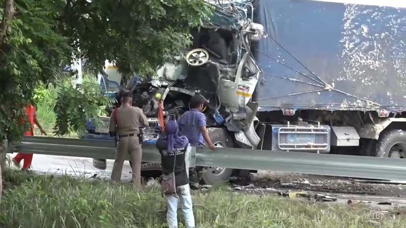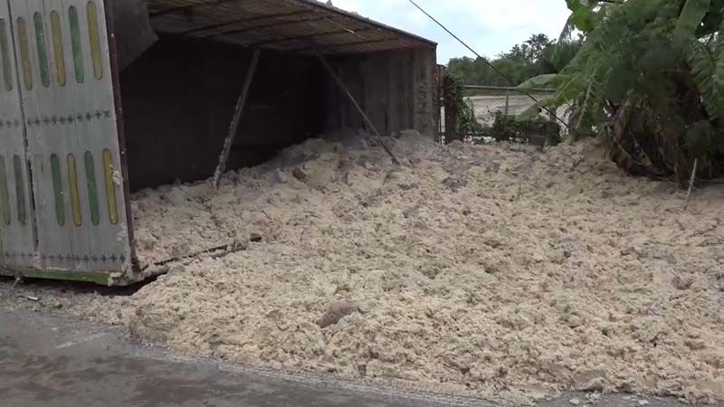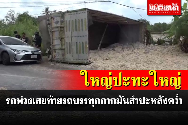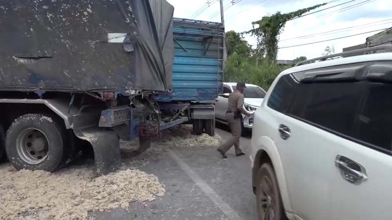 ด้านนายสมพงษ์ ลิ่มสุวัฒนาพงษ์ อายุ 59 ปี คนขับรถพ่วงทะเบียน 87-1878 นคราราชสีมา บรรทุกกากมันสำปะหลัง กล่าวว่าตนเองขับรถออกจากโรงงานแป้งมันเพื่อเอากากสำปะหลังมันมาบ้านขณะที่ตีโค้งเลี้ยวเข้าบ้านตัวแม่พ้นจากถนนใหญ่แล้วคงเหลือตัวลูกยังไม่พ้นจึงทำให้รถพ่วงที่ขับตามมาชนเข้าอย่างจังทำให้พ่วงตัวลูกพลิกคว่ำกากมันสำปะหลังเกลื่อนกระจายเต็มถนน