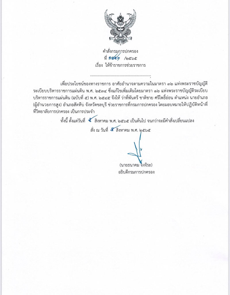 วันที่ 5 สิงหาคม 2565 นายธนาคม จงจิระ อธิบดีกรมการปกครอง ลงนามคำสั่งกรมการปกครอง เรื่องให้ข้าราชการช่วยราชการ โดยเนื้อหาระบุว่า "เพื่อประโยชน์ของทางราชการ อาศัยอำนาจตามความในมาตรา 32 แห่งพระราชบัญญัติระเบียบบริหารราชการแผ่นดิน พ.ศ. 2534 ซึ่งแก้ไขเพิ่มเติมโดยมาตรา 12 แห่งพระราชบัญญัติระเบียบบริหารราชการแผ่นดิน (ฉบับที่ 5 ) พ.ศ. 2545 จึงให้ ว่าที่พันตรี ชาติชาย ศรีโพธิ์อ่อน ตำแหน่ง นายอำเภอ (ผู้อำนวยการสูง) อำเภอสัตหีบ จังหวัดชลบุรี ช่วยราชการที่กรมการปกครอง โดยมอบหมายให้ปฏิบัติหน้าที่ ที่วิทยาลัยการปกครอง เป็นการประจำ ทั้งนี้ ตั้งแต่วันที่ 5 สิงหาคม พ.ศ. 2565 เป็นต้นไป จนกว่าจะมีคำสั่งเปลี่ยนแปลง