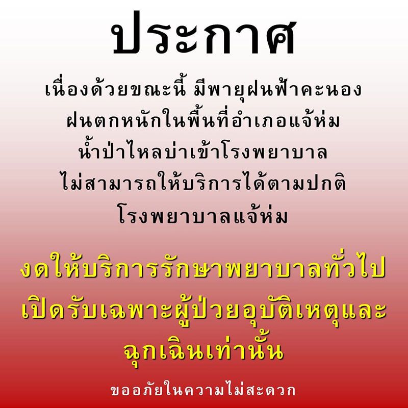 รพ.แจ้ห่ม จ.ลำปาง โพสต์แจ้งประกาศ เมื่อ 12.37 น. ระบุเนื่องด้วยขณะนี้ มีพายุฝนฟ้าคะนองฝนตกหนักในพื้นที่อำเภอแจ้ห่มน้ำป่าไหลหลากเข้าโรงพยาบาล ไม่สามารถให้บริการได้ตามปกติ งดให้บริการรักษาพยาบาลทั่วไปเปิดรับเฉพาะผู้ป่วยอุบัติเหตุและฉุกเฉินเท่านั้น