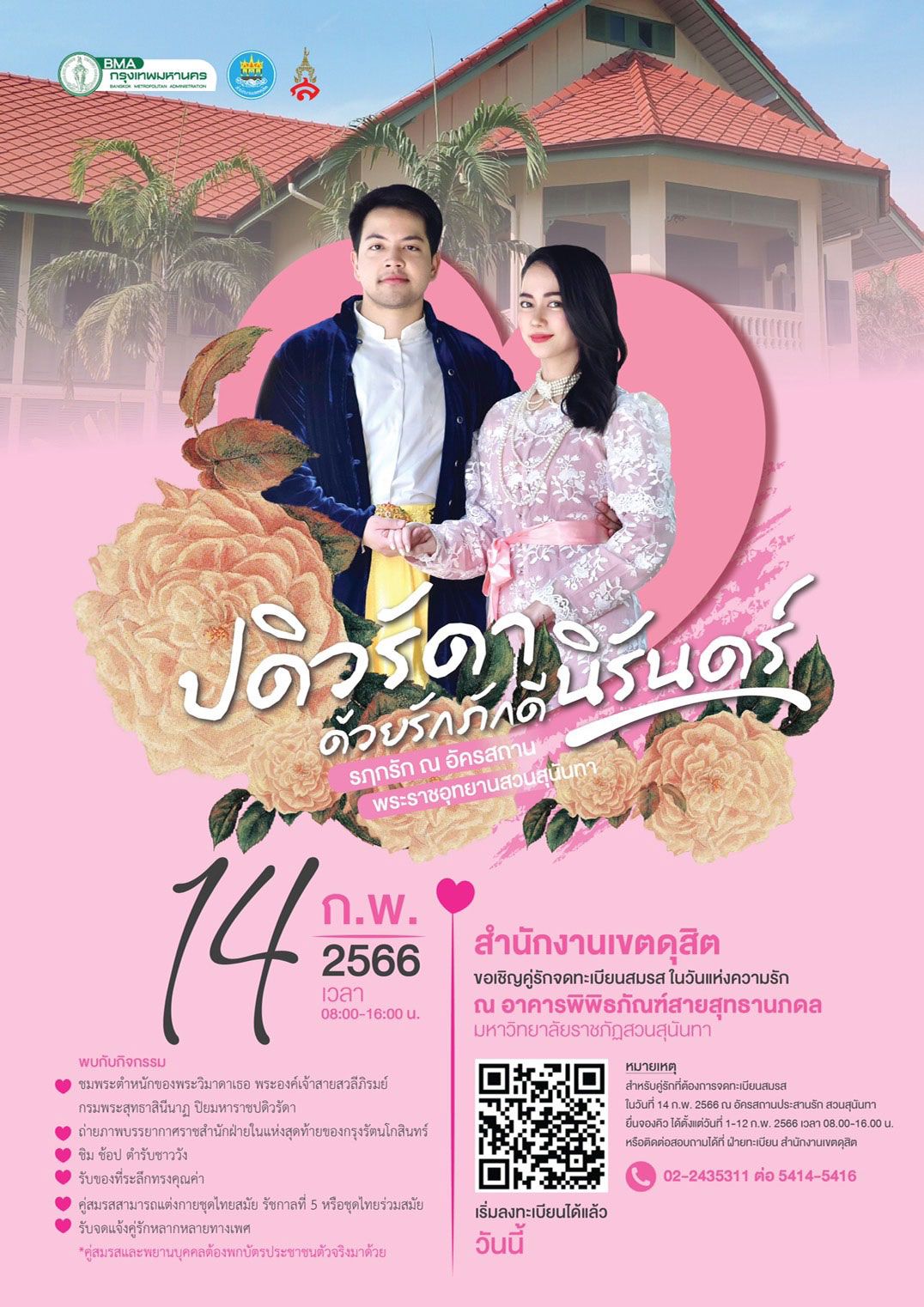 สำหรับ 6 เขตที่จัดจดทะเบียนสมรสนอกพื้นที่ ดังนี้ 1.เขตดุสิตจัดงาน “ปดิวรัดา ด้วยรักภักดีนิรันดร์”รฤกรัก ณ อัครสถานพระราชอุทยานสวนสุนันทา อาคารพิพิธภัณฑ์สายสุทธานภดล มหาวิทยาลัยราชภัฏสวนสุนันทา เวลา 08.00-16.00 น.เชิญคู่รักแต่งกายด้วยชุดไทยสมัยรัชกาลที่ 5 หรือชุดไทยร่วมสมัยมาจดทะเบียนสมรสนอกสำนักทะเบียนสัมผัสกับบรรยากาศชาววังสุด exclusiveพร้อมมุมถ่ายภาพมากมาย พิเศษสุดสำหรับคู่รัก LGBTQI+ สามารถจดแจ้งชีวิตคู่ ย้ำจุดยืนสมรสเท่าเทียมและเสมอภาค ในงานมีของที่ระลึกและของรางวัลมากมาย สอบถามเพิ่มเติมที่ฝ่ายทะเบียน โทร.02-2435311-15ต่อ 5414-5416 2.เขตป้อมปราบศัตรูพ่ายจัดงาน “รักแท้ไม่แพ้พ่าย @ป้อมปราบศัตรูพ่าย” ณ ห้องซันเซท ชั้น 11โรงแรมปรินซ์พาเลซ เวลา 08.00-16.00 น. มอบของที่ระลึกทุกคู่ พร้อมชวนคู่รัก LGBTQ ร่วมบันทึกจดแจ้งคู่สมรสเพศเดียวกัน สอบถามเพิ่มเติมที่ฝ่ายทะเบียน โทร.02-2813673 หรือ 02-2810281 3.เขตปทุมวัน จัดงาน “รักนี้ ไม่มี Sad @ปทุมวัน” ร่วมกับ เอ็ม บี เค เซ็นเตอร์ ชวนคู่รัก จูงมือมาจดทะเบียนสมรสในวันวาเลนไทน์ ณ ศูนย์การค้า เอ็ม บี เค เซ็นเตอร์ บริเวณ Meeting Point ชั้น G เวลา 10.00-16.00 น. มีกิจกรรมคู่รัก พร้อมลุ้นรับของรางวัล อาทิ จี้ทองคำรูปหัวใจ ทะเบียนสมรสขนาด A3 และมีประกวดชุดคู่รักลุ้นรางวัล บัตรกำนัล MBK และอื่นๆ มากมาย สอบถามโทร.02-2141048 ต่อ 6308
