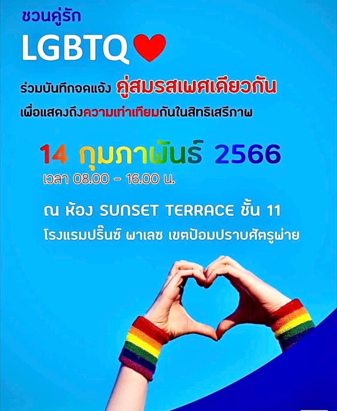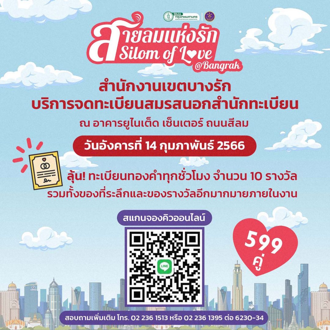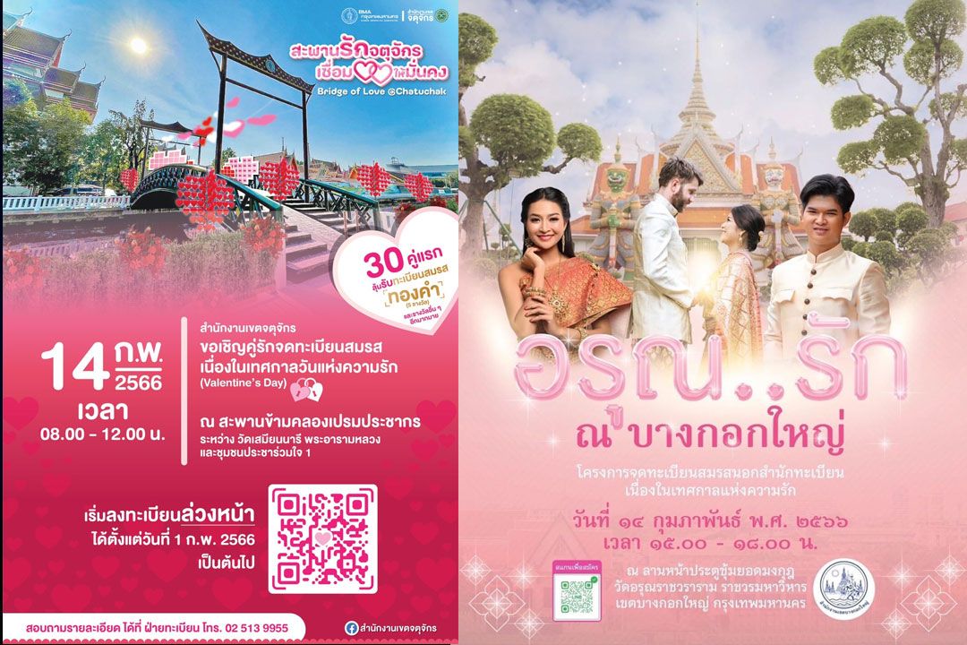 6 เขต กทม.จัดจดทะเบียนสมรสนอกเขตวาเลนไทน์นี้ บางรักลุ้นทะเบียนทองคำ10 ฉบับ - จตุจักร 5 รางวัล - ปทุมวันจี้หัวใจทอง / ดุสิต-ป้อมปราบฯ ให้จดแจ้ง LGBTQ สมรสเท่าเทียม