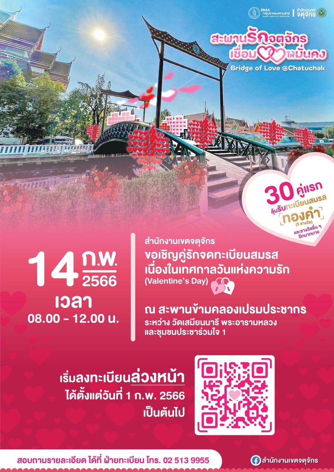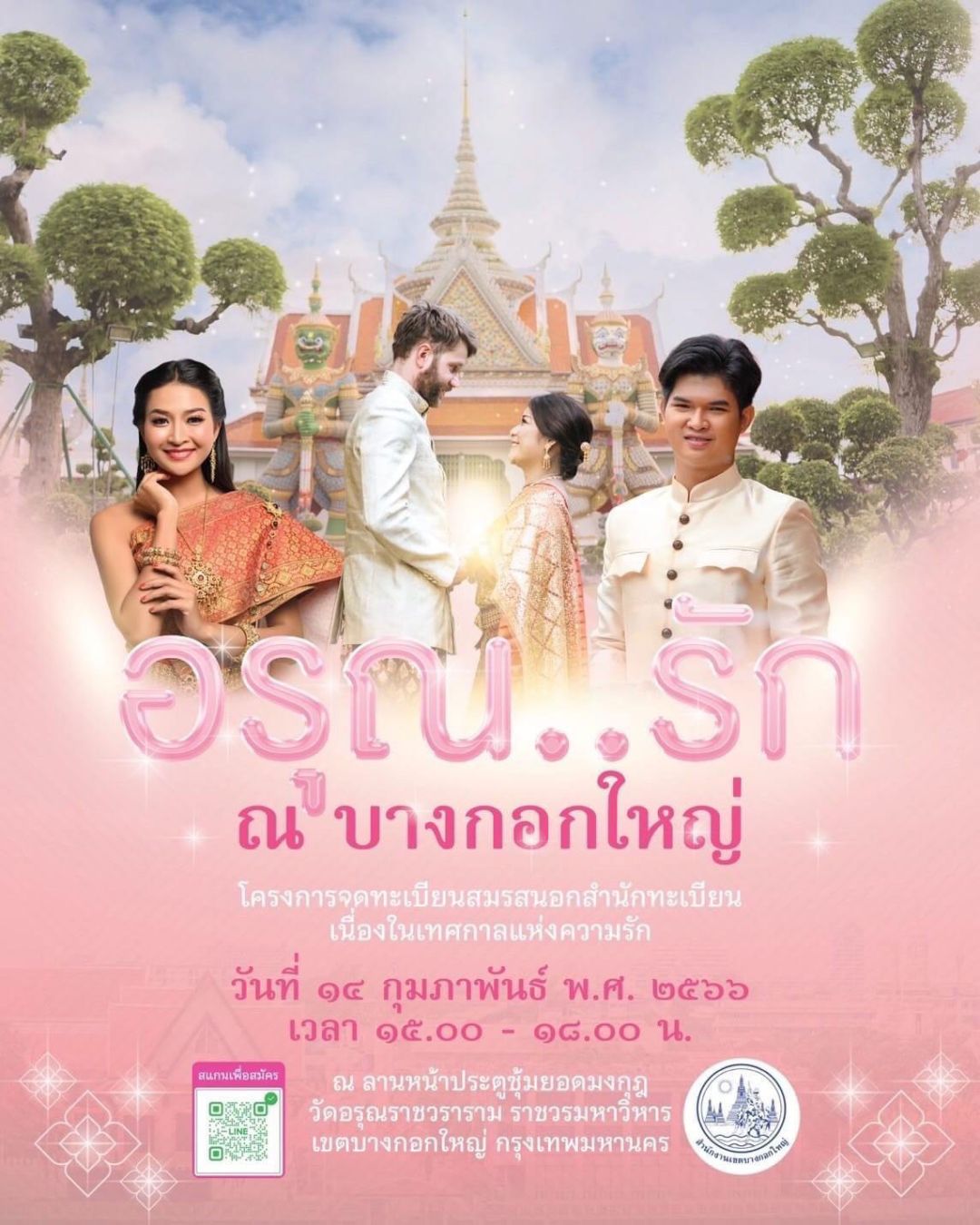 4.เขตบางรัก จัดงาน “สายลมแห่งรัก (Silom of Love@Bangrak)” ณ อาคารยูไนเต็ด เซ็นเตอร์ สีลม เวลา 08.00-16.00 น.สำหรับคู่รักที่ลงทะเบียนล่วงหน้า599 คู่ ทุกคู่จะได้รับของที่ระลึก และทุกชั่วโมงจะมีการจับสลากมอบทะเบียนสมรสทองคำ ชั่วโมงละ1 ฉบับ รวมทั้งสิ้น 10 ฉบับ และมีกิจกรรมให้ร่วมสนุกลุ้นรับของรางวัลมากมาย สอบถามเพิ่มเติมโทร. 02-2361513 ต่อ 6231, 6233 5.เขตจตุจักรจัดงาน “Bridge of Love @Chatuchak” ณ ลานอเนกประสงค์ ชุมชนประชาร่วมใจ 1เวลา 08.00-12.00 น. 30 คู่แรกลุ้นรับทะเบียนสมรสทองคำ 5 รางวัลสอบถามโทร. 02-5139955 ต่อ 5207-9 6.เขตบางกอกใหญ่จัดงาน “อรุณ..รัก ณ บางกอกใหญ่” ณ วัดอรุณราชวรารามฯ เวลา 15.00-18.00 น. ในบรรยากาศย้อนยุค มีพิธีเจริญพระพุทธมนต์ ถวายเครื่องไทยธรรม ก่อนจดทะเบียนสมรสปิดท้ายด้วยพิธีผูกข้อมือกล่าวให้พรโดยแขกผู้ใหญ่ ณ ลานหน้าประตูซุ้มยอดมงกุฎ วัดอรุณราชวรารามฯ สอบถามโทร.02-8682513 ต่อ 5708-5711