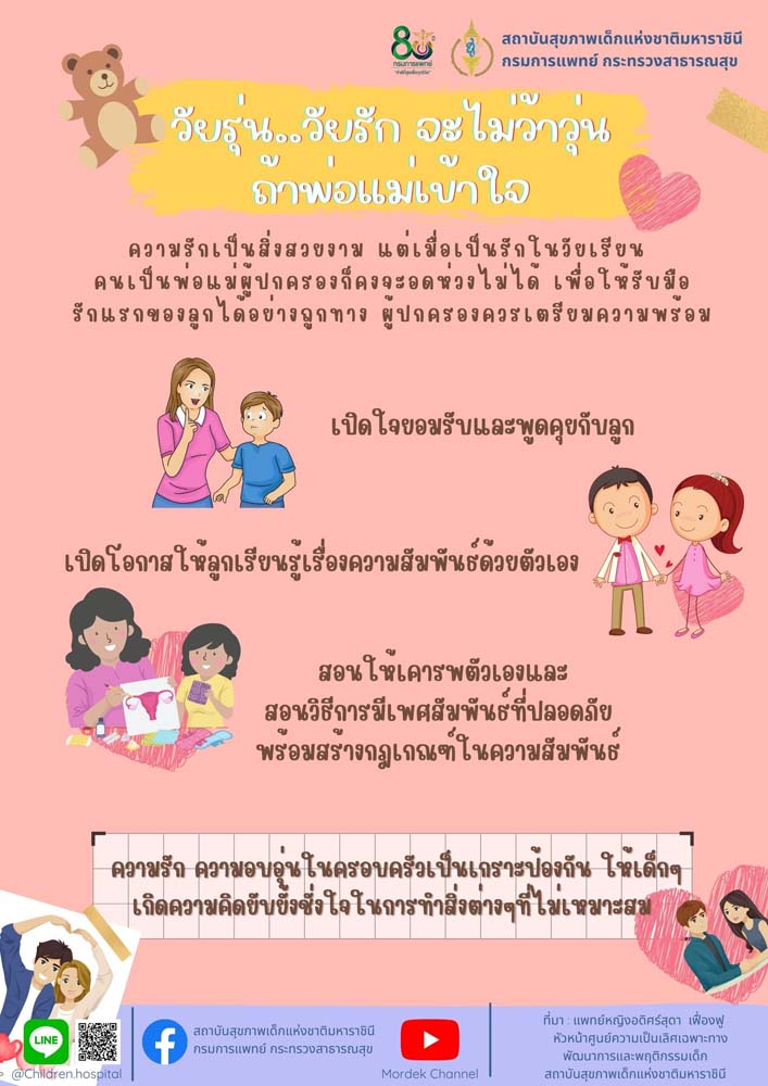 กรมการแพทย์ โดยสถาบันสุขภาพเด็กแห่งชาติมหาราชินี เผย ความรักเป็นสิ่งสวยงามและเป็นสิ่งที่ดี ความรักที่ผู้ปกครองมีให้ต่อลูกเต็มเปี่ยมไปด้วยความเป็นห่วง เมื่อลูกๆ เข้าสู่วัยรุ่น คุณพ่อคุณแม่มักคิดแทนและคิดนำไปก่อนลูกทำให้เขารู้สึกอึดอัด ดังนั้นสิ่งแรกที่ควรทำคือเข้าใจ ต้องปฏิบัติต่อเขาให้เหมือนคนๆหนึ่งที่มีความคิดและความมั่นใจเป็นของตนเอง