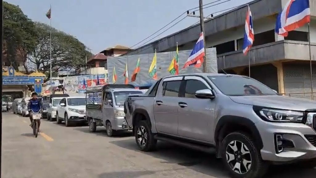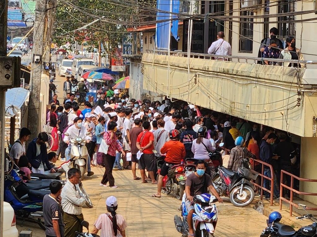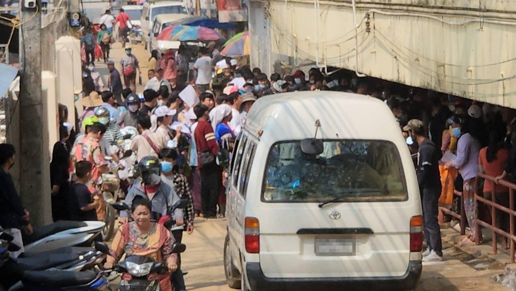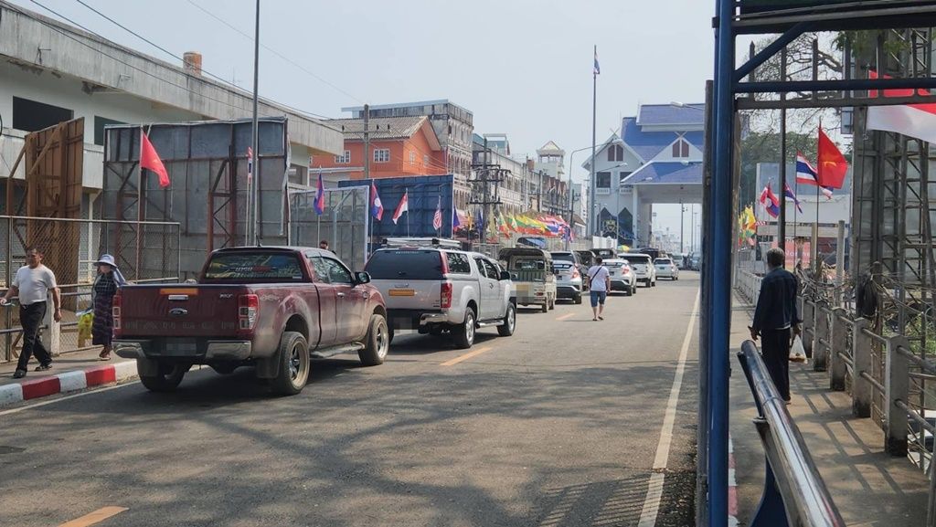 ชาวเมียนมารอต่อแถวเพื่อข้ามแดนผ่านทางด่านพรมแดนไทย-เมียนมาสะพานมิตรภาพแห่งที่ 1 อำเภอแม่สายกันคึกคัก หอการค้าแม่สายชี้เงินสะพัดเพิ่มปีละกว่าหมื่นล้าน