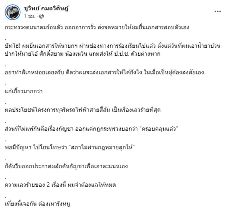 วันที่ 28 กุมภาพันธ์ 2566 หลังจากที่กระทรวงคมนาคมทำหนังสือถึงนายชูวิทย์ กมลวิศิษฏ์ อดีตนักการเมือง ขอหนังสือหลักฐานทุจริตโครงการรถไฟฟ้าสายสีส้มเมื่อวันที่ 27 กุมภาพันธ์ที่ผ่านมานั้น