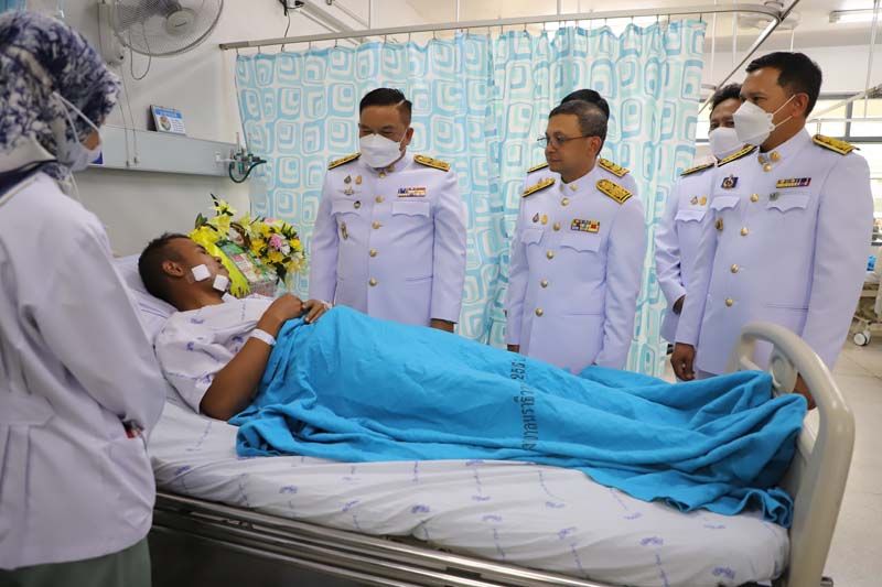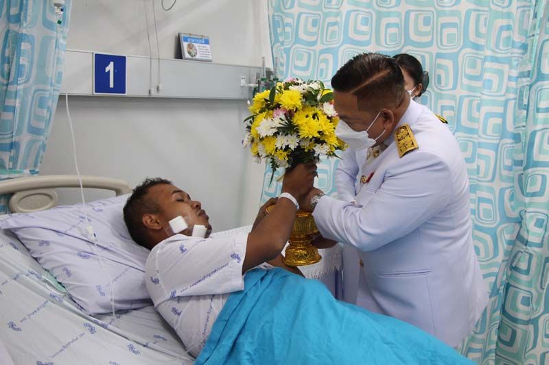 “ในหลวง” โปรดเกล้าฯให้ ผู้ว่าฯนราธิวาส เชิญดอกไม้และตะกร้าสิ่งของพระราชทานไปมอบสิบเอก ศักย์ศรณ์ สายน้ำ เจ้าหน้าที่ชุดทำลายล้างวัตถุระเบิดอโณทัย ที่บาดเจ็บจากเหตุคนร้ายจุดชนวนระเบิด