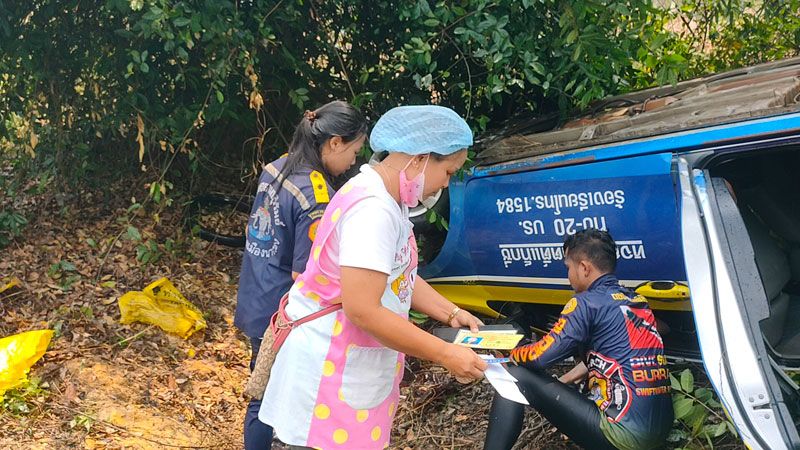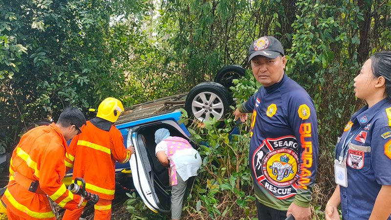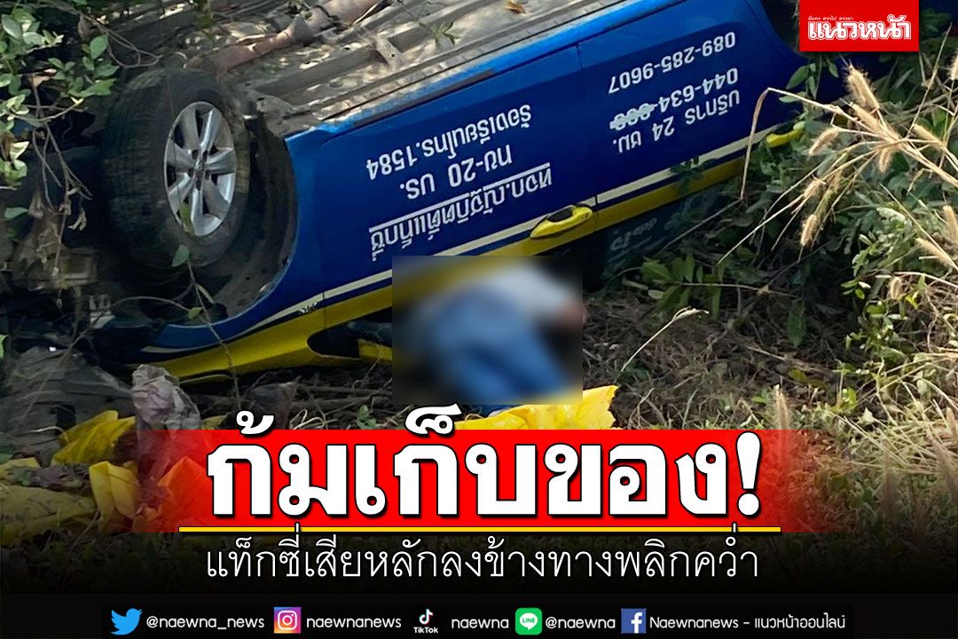 แค่เสี้ยววินาที! โชเฟอร์แท็กซี่วัย 50 ที่บุรีรัมย์ ก้มเก็บของตกที่วางเท้า เงยหน้าขึ้นมา ตกใจเสียหลักตกข้างทางพลิกคว่ำ กู้ภัยหวั่นกลิ่นแก๊สรั่ว รีบประสานรถดับเพลิงระดมฉีดน้ำหล่อเลี้ยง กระทั่งคนขับคลานออกมาจากซากรถได้