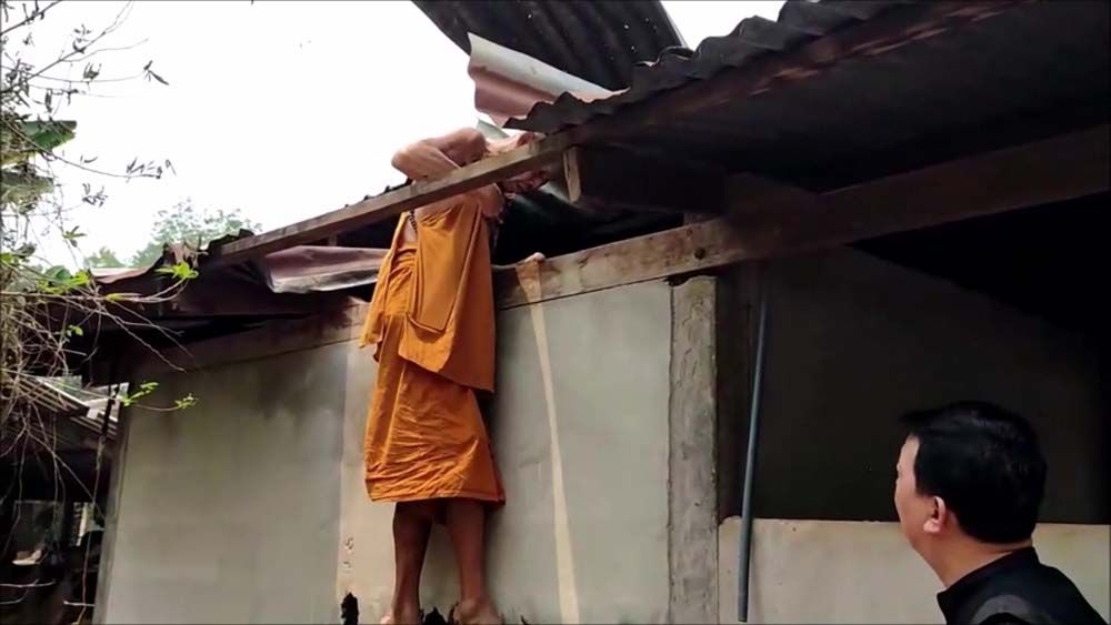 หลวงตาบุญโฮม เล่าเหตุการณ์ช่วยเด็กรอดจากไฟไหม้ว่า ตอนเกิดเหตุนั้นอาตมากำลังรดน้ำต้นไม้ที่บริเวณกุฏิ แล้วได้ยินเสียงคนร้องเอะอะโวยวายมีกลุ่มควันขึ้นมาจากบ้านซึ่งอยู่ใกล้วัด จึงรีบวิ่งออกไปช่วยดับไฟโดยเอาผ้าชุบน้ำแล้ววิ่งออกไปด้วย พอไปถึงบ้านเกิดเหตุก็ช่วยดับไฟก่อน แต่ตอนนั้นก็ไม่รู้ว่ามีเด็กติดอยู่ภายในประมาณ 2 นาที ได้ยินคนร้องบอกว่ามีเด็กติดอยู่ภายในถึงวิ่งอ้อมไปด้านหลังและปีนขึ้นไปดูที่บริเวณห้องน้ำไปพบว่าเห็นเด็ก 2 คนอยู่ที่อ่างน้ำ จึงง้างหลังคาออกรีบทำการช่วยเหลือ โดยเอาเด็กคนโตออกมาก่อนแล้วก็ทำการช่วยเหลือคนเล็ก ทั้งนี้หากเด็ก 2 คนไม่ได้รับการช่วยเหลือตอนนั้นคาดว่าไม่เกิน 2 นาที เด็กคงเสียชีวิตเพราะไฟผมหนักมากซึ่งตอนนั้นก็รู้สึกกลัวแต่ก็ต้องเร่งช่วยคนก่อนเพราะมีความสงสาร สำหรับอาตมาทำงานที่สิงคโปร์ ได้ฝึกการดับเพลิงและช่วยเหลือคนติดภายในกองไฟมาแล้ว ก็เลยนำมาช่วยเด็กทั้ง 2 คนนี้