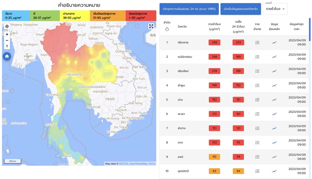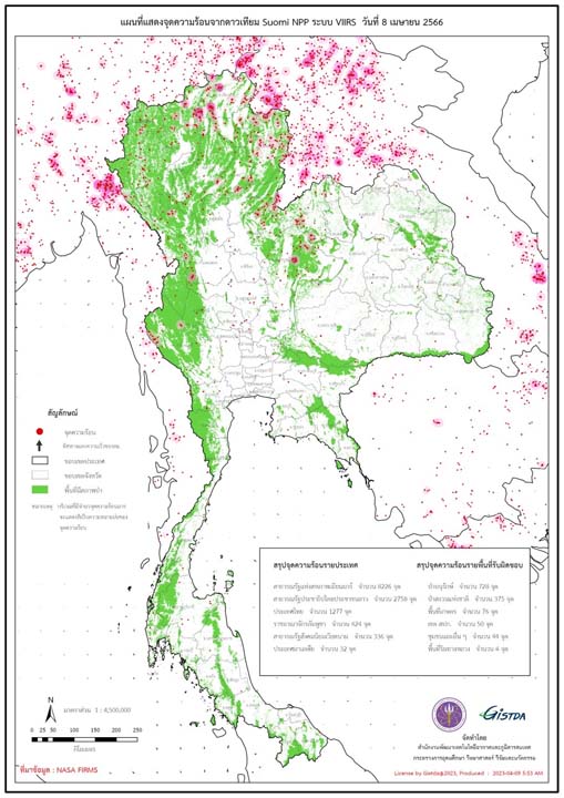 9 เมษายน 2566 สำนักงานพัฒนาเทคโนโลยีอวกาศและภูมิสารสนเทศ (องค์การมหาชน) หรือ GISTDA เปิดเผยข้อมูลจากดาวเทียมซูโอมิ เอ็นพีพี (Suomi NPP) ของวันที่ 8 เมษายน 2566 ไทยพบจุดความร้อน 1,277 จุด โดยมีเพื่อนบ้านอย่างพม่านำอยู่ที่ 8,226 จุด , สปป.ลาว 2,758 จุด , กัมพูชา 424 จุด, เวียดนาม 336 จุด และมาเลเซีย 32 จุด