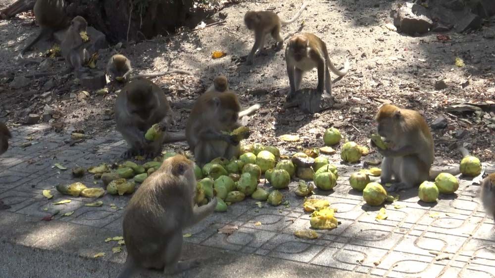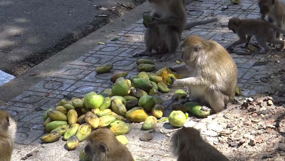 ฝูงลิงเขาน้อย และเขาตังกวน สมานฉันท์ล้อมวงปาร์ตี้มะม่วงสุกและฝรั่ง หลังมีพ่อค้าผลไม้นำมาให้กิน เพราะมะม่วงและฝรั่งสุกจนงอมขายไม่ได้แล้ว และจะทิ้งก็เสียดาย เลยเก็บใส่ถุงนำมาให้เป็นอาหารลิงได้บุญด้วย