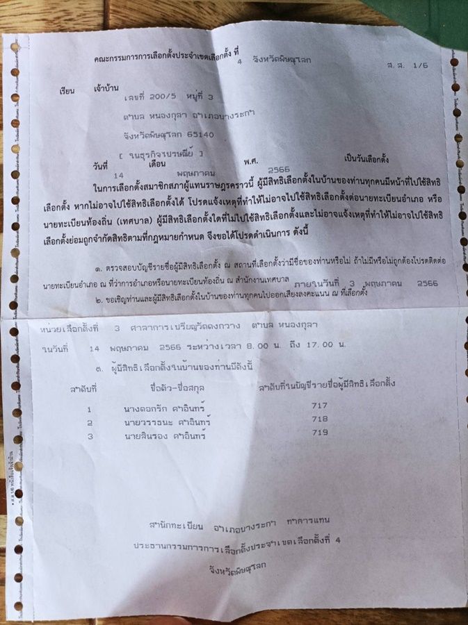 วันที่ 1 พ.ค.66 ผู้สื่อข่าวรายงานว่า มีหนังสือจากคณะกรรมการการเลือกตั้งเขต 4 พิษณุโลกส่งถึงเจ้าบ้าน เลขที่ 200/5 หมู่ 3 ตำบลหนองกุลา อำเภอบางระกำ จังหวัดพิษณุโลก ให้ตรวจสอบบัญชีรายชื่อผู้สิทธิเลือกตั้งก่อน 3 พ.ค.นี้และเชิญให้ไปใช้สิทธิ์เลือกตั้งหน่วยเลือกตั้งที่ 3 ศาลากลางเปรียญวัดดงกวาง ตำบลหนองกุลา อำเภอบางระกำ โดยระบุรายชื่อ 3 คน คือ พ่อ-แม่และนายวรรธนะ คำอินทร์