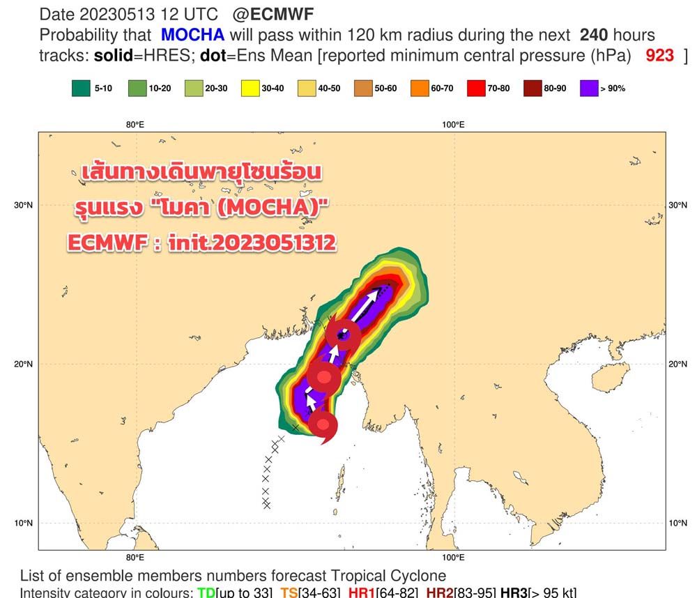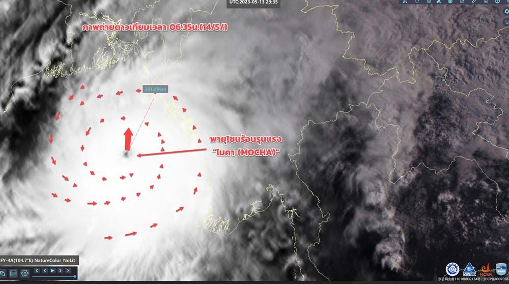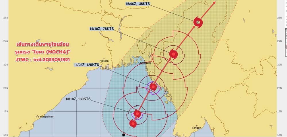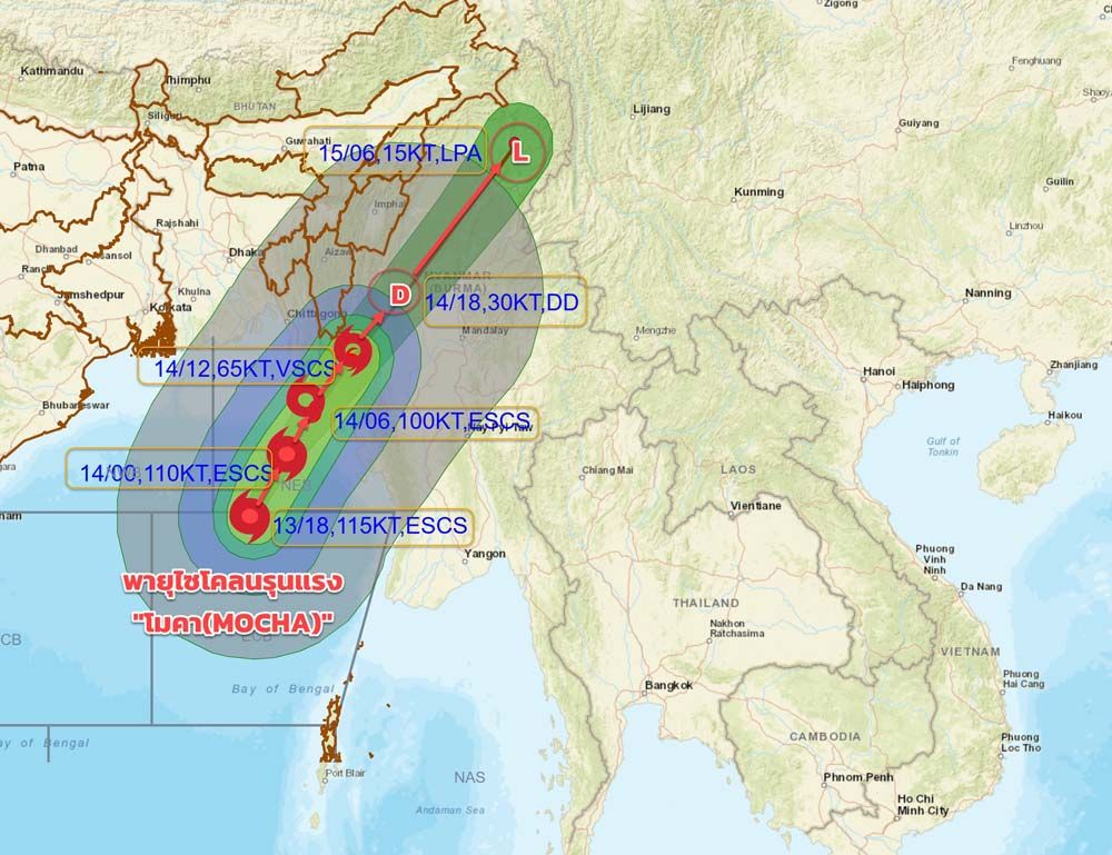 วันที่ 14 พฤษภาคม 2565 นายสมควร ต้นจาน ผู้อำนวยการส่วนพยากรณ์อากาศกลาง กองพยากรณ์อากาศ กรมอุตุนิยมวิทยา ได้โพสต์เฟซุบ๊ก ระบุว่า อัพเดทพายุไซโคลนรุนแรง "โมคา (MOCHA)" บริเวณอ่าวเบงกอลตอนบน ยังแรงต่อเนื่อง RSMC New Delhi (อินเดีย) ให้แรงระดับ เป็น Extremely Severe Cyclonic Storm (ใกล้เคียงกับระดีบ super typhoon) กำลังเคลื่อนตัวไปทางเหนือ ตะวันออกเฉียงเหนือ คาดว่าศูนย์กลางของพายุจะเคลื่อนเข้าขึ้นฝั่งประเทศเมียนมาตอนบนและบังคลาเทศ (ห่างจากทางตอนใต้ของเมือง Cox’s Bazar (บังคลาเทศ) ประมาณ 400 และ เมือง Sittwe ประเทศเมียนมา 250 กม. ในช่วงบ่ายวันนี้ (14 พ.ค.66) หลังจากนั้นจะอ่อนกำลังลงตามลำดับ