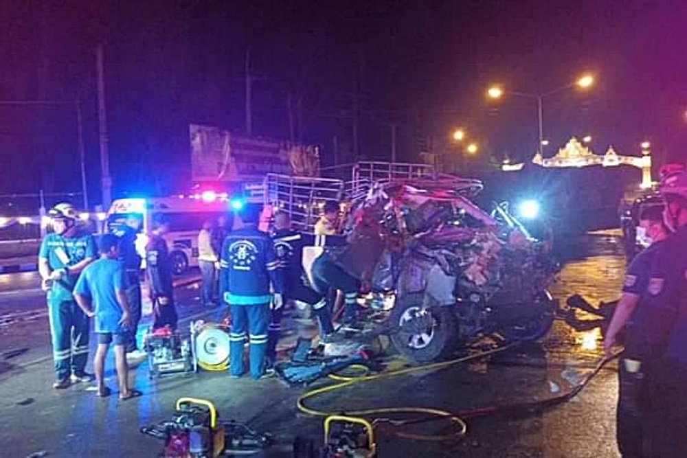 รถบรรทุกพุ่งชนกระบะขนแรงงานต่างด้าวดับ 5 สาหัส 12 ราย คนขับรับหลับใน