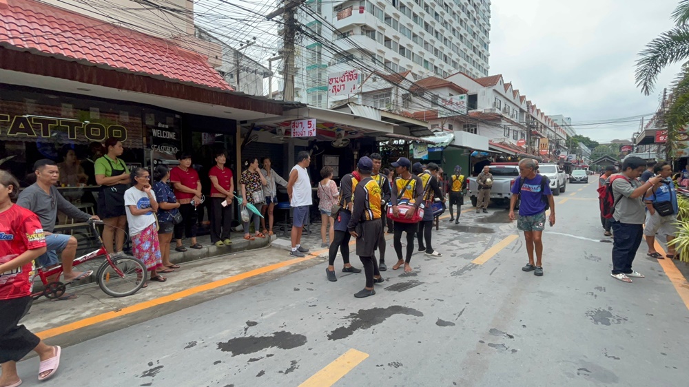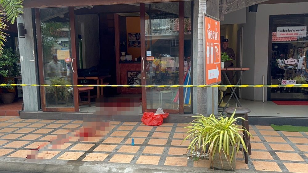 ที่เกิดเหตุเป็นตึกอาคารสูง 3 ชั้น ชั้นล่างเปิดเป็นร้านขายกาแฟและอาหาร ส่วนชั้น 2-3 เปิดเป็นห้องพัก โดยพื้นชั้นล่างมีคราบเลือดนองพื้นจำนวนมาก ตรวจสอบพบชายไทยทราบชื่อนายสุนทร หรือเบน อายุ 57 ปี เป็นเทรนเนอร์ออกกำลังกายและอดีตกรรมการตัดสินฟุตบอลระดับไทยลีกอยู่ในอาการคลุ้มคลั่งเลือดไหลนองร่าง ที่ลำคอมีแผลเหวอะหวะ ในมือถือมีดสปาต้ายาวประมาณ 40 ซม.โดยใช้สายรัดด้ามมีดมัดติดกับข้อมือไว้แน่น พร้อมขวัดแกว่งมีดไปมา เจ้าหน้าที่จึงตัดสินใจเข้าชาร์จก่อนที่เจ้าตัวจะหมดสติล้มฟุบไปกองกับพื้น นอนหายใจรวยริน ทีมกู้ภัยต้องรีบปฐมพยาบาลแล้วนำตัวส่งโรงพยาบาลเมืองพัทยา นอกจากนี้ตำรวจยังยึดมีดที่ใช้ก่อเหตุไว้เป็นหลักฐาน ส่วนคนเจ็บหลังถึงมือหมอพบว่ามีบาดแผลถูกแทงด้วยอาวุธมีดเข้าที่ช่องท้องจนไส้ทะลัก ลำคอถูกปาดจนเกือบถึงหลอดลม