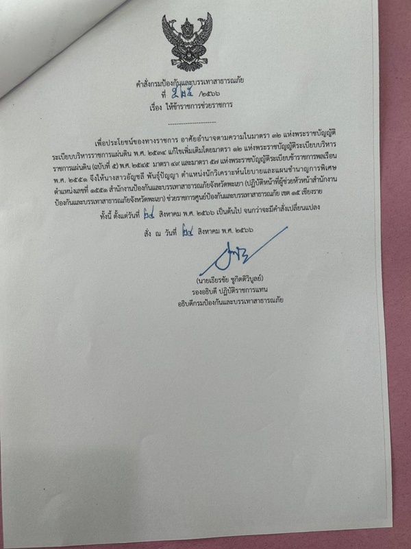 ล่าสุดทางกรมป้องกันและบรรเทาสาธารณภัย ได้มีคำสั่งย้ายเจ้าหน้าที่คนดังกล่าวให้ไปช่วยราชการศูนย์ป้องกันและบรรเทาสาธารณภัย เขต 15 เชียงรายตามคำสั่งที่ 2/2566 เรื่อง ให้ข้าราชการช่วยราชการ ลงนามโดยนายเธียรชัย ชูกิตติวิบูลย์ รองอธิบดี ปฏิบัติราชการแทน อธิบดีกรมป้องกันและบรรเทาสาธารณภัย โดยระบุว่า "เพื่อประโยชน์ของทางราชการ อาศัยอำนาจตามความในมาตรา 32 แห่งพระราชบัญญัติ ระเบียบบริหารราชการแผ่นดิน พ.ศ. 2534 แก้ไขเพิ่มเติมโดยมาตรา 12 แห่งพระราชบัญญัติระเบียบบริหาร ราชการแผ่นดิน (ฉบับที่ 5) พ.ศ. 2555 มาตรา 49 และมาตรา 57 แห่งพระราชบัญญัติระเบียบข้าราชการพลเรือน พ.ศ. 2551