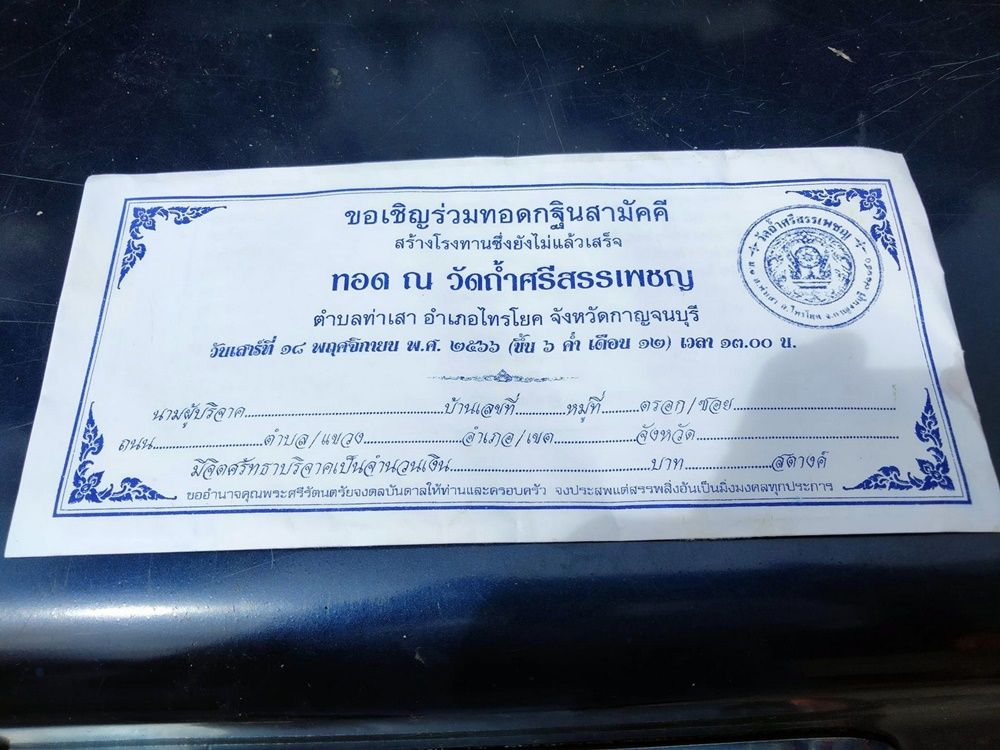 ผู้สื่อข่าวรายงานว่า ในเฟสบุ๊กยังมีซองทำบุญทอดกฐิน โดยจ่าหน้าซองว่า ขอเชิญร่วมทอดกฐินสามัคคี สร้างโรงทานซึ่งยังไม่แล้วเสร็จ ทอด ณ วัดถ้ำศรีสรรเพชญ ตำบลไทรโยค อำเภอไทรโยค จังหวัดกาญจนบุรี วันเสาร์ที่ 18 พฤศจิกายน พ.ศ.2566 (ขึ้น 6 ค่ำ เดือน 12) เวลา 13.00 น.