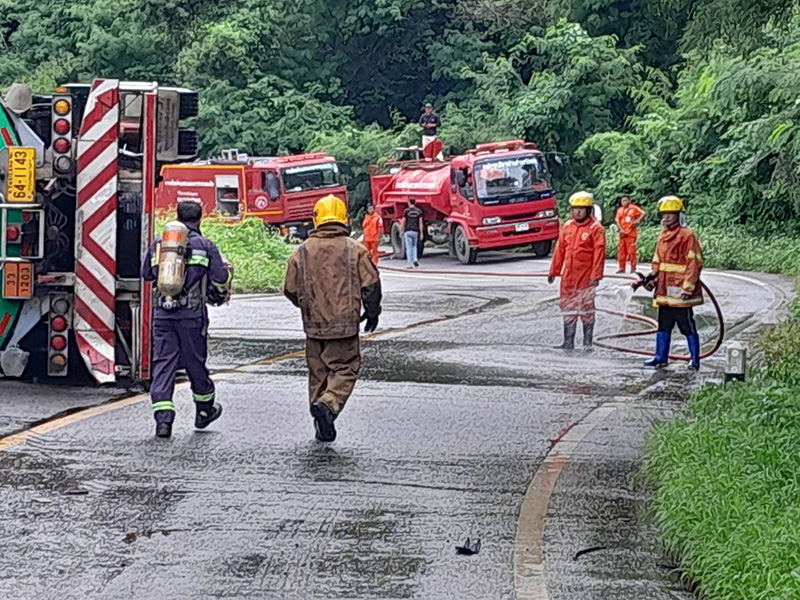 ในที่เกิด พบรถบรรทุกน้ำมัน หมายเลขทะเบียน 64-1143 กรุงเทพมหานคร พลิกตะแคงอยู่ฝั่งถนน ขาลงเขาพังเหย มุ่งหน้าไปตัวอำเภอภัคดีชุมพล พบว่าบริเวณถังบรรจุน้ำมันได้รับความเสียหาย มีน้ำมันรั่วออกมาจากตัวถัง