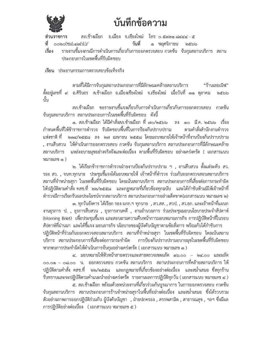 คำชี้แจงดังกล่าว ประกอบด้วยภาพการปฏิบัติงาน ระบุรายละเอียดยาวกว่า 85 หน้ากระดาษ ใจความหลักระบุว่า ทาง สภ.ช้างเผือก ได้มีการประชุมดำเนินการปราบปรามสิ่งผิดกฎหมายในพื้นที่มาอย่างต่อเนื่อง โดยในห้วงเวลาที่ผ่านมาได้เคยเรียกผู้ประกอบการสถานบันเทิงในพื้นที่มาประชุมชี้แจงทุกสัปดาห์ เพื่อขอความร่วมมือให้ดำเนินการตามกฎระเบียบของทางราชการ เปิด-ปิดให้ตรงเวลา ห้ามให้เด็กเยาวชนเข้าใช้บริการสถานบันเทิง ห้ามเป็นแหล่งมั่วสุมและแพร่ระบาดของยาเสพติด