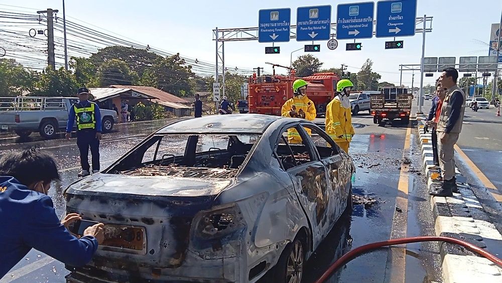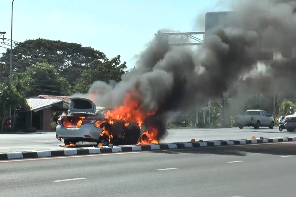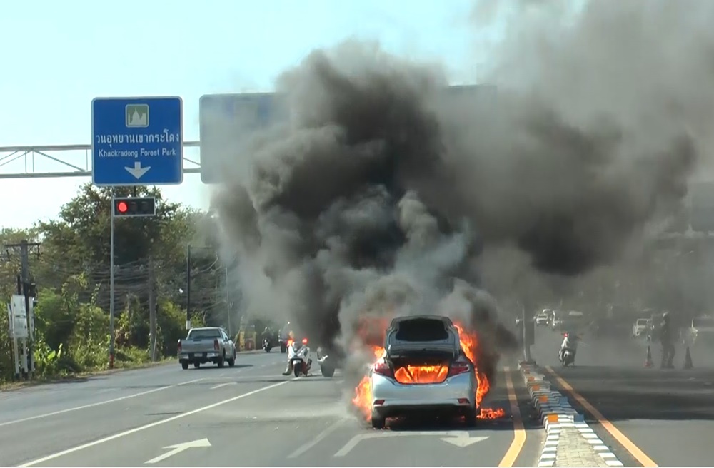 ระทึกไฟไหม้รถเก๋งชาวอินโดนีเซียทีมงานนักแข่งขณะจอดติดไฟแดงหน้าสนามบอลช้างอารีน่า เสียงดังคล้ายระเบิดเป็นระยะหนีตายลงจากรถก่อนลุกท่วมวอดทั้งคัน ผู้การตำรวจบุรีรัมย์ ลงพื้นที่อำนวยความสะดวกด้านการจราจรด้วยตนเอง ต้องปิดกั้นถนนเพื่อความปลอดภัย